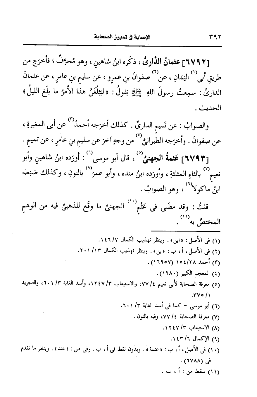 ذَكَرَهُ ابن شاهين وهو محرف فاخرج من طريق أبي اليمان، عَن صفوان بن عمرو، عَن سليم، عَن عامر، عَن عثمان الدَّاريّ سمعت رسول الله صَلى الله عَلَيه وسَلم يقول ليبلغن هذا الأمر ما بلغ الليل ...الحديث.