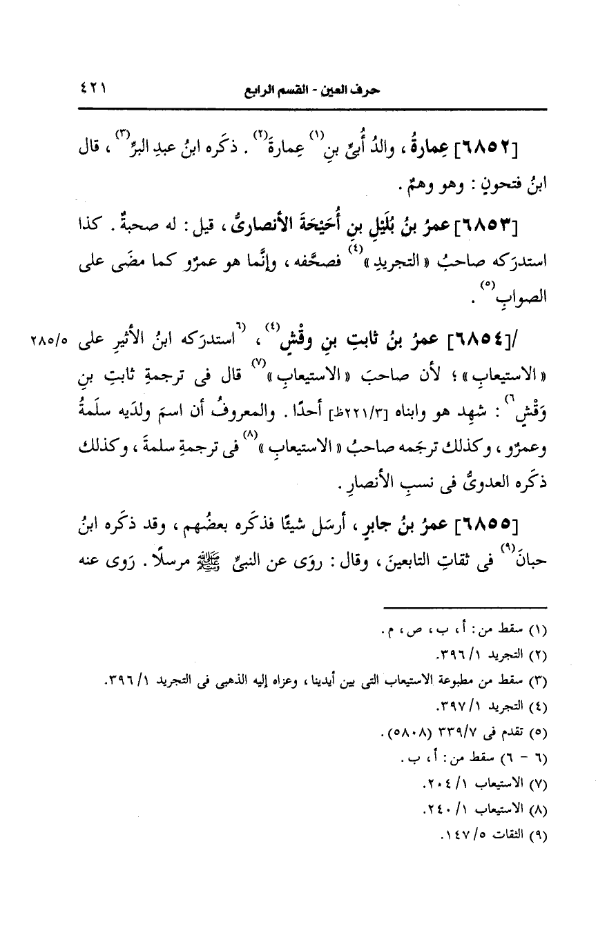 استدركه ابن الأَثِير على الاستيعاب لان صاحب الاستيعاب قال في ترجمة ثابت بن وقش شهد هو وابناه عَمرو وعمر أحدا والمعروف ان اسم ولديه سلمة وعمر وكذلك ترحمة صاحب الاستيعاب في ترجمة سلمة.