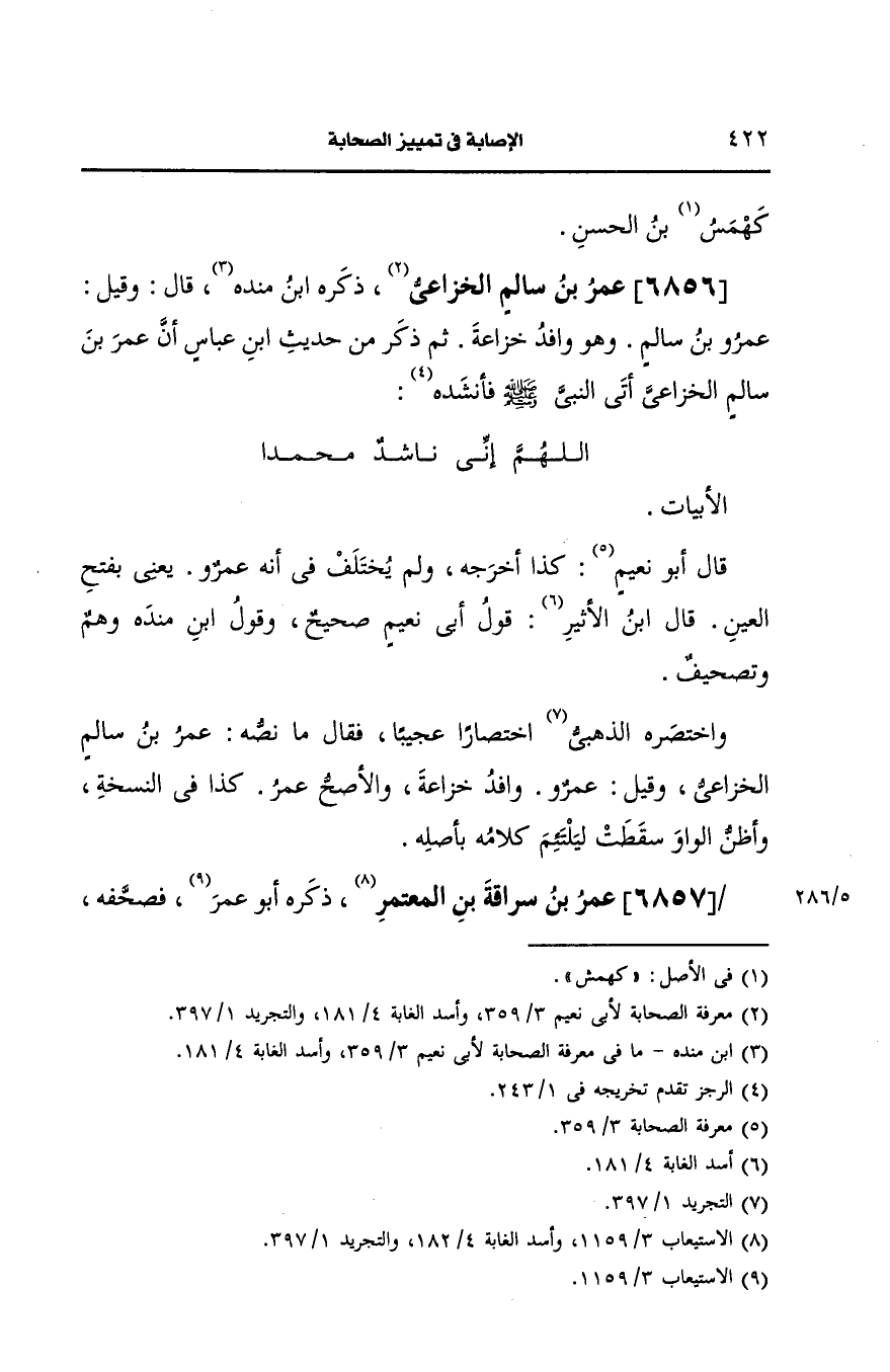 واختصره الذهبي اختصارا عجيبا فقال ما نصه عمر بن سالم الخُزاعيّ وقيل عَمرو وافد خزاعة والأصح عمر كذا في النسخة وأظن الواو سقطت ليلتئم كلامه بأصله.