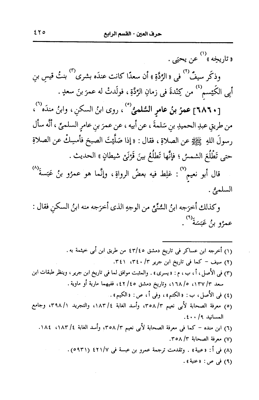 روى ابن السَّكَن، وابن مَنْدَه من طريق عبد الحميد بن سلمة، عَن أَبيه، عَن عمر بن عامر السلمي أنه سأل رسول الله صَلى الله عَلَيه وسَلم، عَن الصلاة فقال إذا صليت الصبح فأمسك، عَن الصلاة حتى تطلع الشمس فأنها تطلع بين قرني شيطان الحديث.