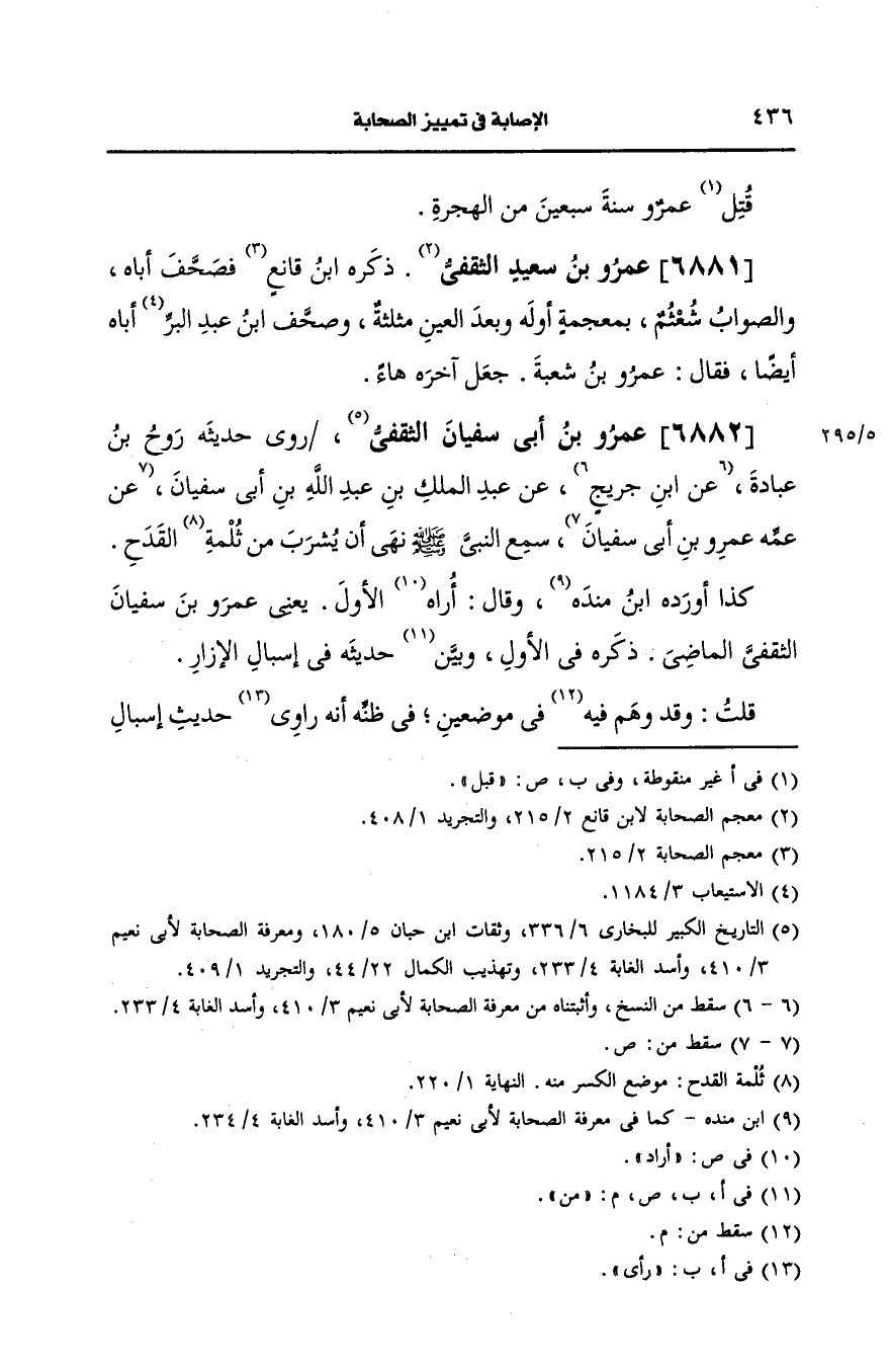 قلت: وقد وهم في موضعين في ظنه أنه راوي حديث اسبال الإزار, وفي قوله سمع النَّبيّ صَلى الله عَلَيه وسَلم اما الأول فلأن الراوي عنه القاسم أَبو عبد الرحمن الشامي ولا رواية له، عَن عَمرو بن أبي سفيان الثَّقفي أصلا وأما الثاني فلأنه سقط منه اسم الصحابي فان البُخارِيّ قال في التاريخ عبد الملك بن عَبد الله بن أبي سفيان روى، عَن عمه عَمرو بن سفيان بن حارثة الثَّقفي، عَن عم أَبيه العلاء بن حارثة.