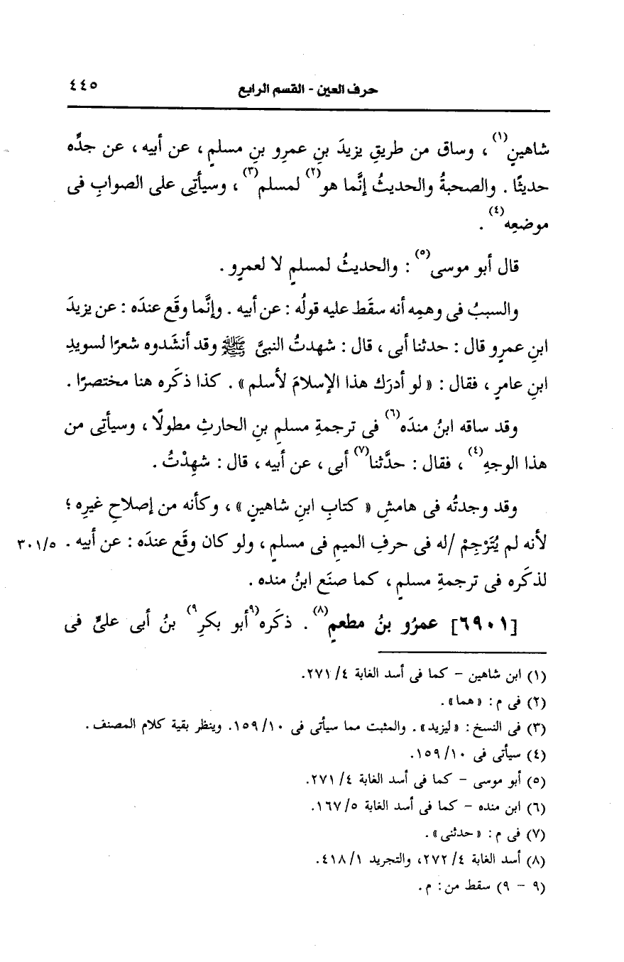 وعزاه لابن أبي عاصم وهو ما رواه، عَن سلمة بن شبيب، عَن عبد الرزاق، عَن معمر، عَن الزُّهْرِيّ، عَن عرفجة بن محمد، عَن عَمرو بن مطعم، عَن أَبيه ان أباه أخبره أنه بينما هو يسير مع النَّبيّ صَلى الله عَلَيه وسَلم مقفله من حنين فلقيه الاعراب يسألونه.