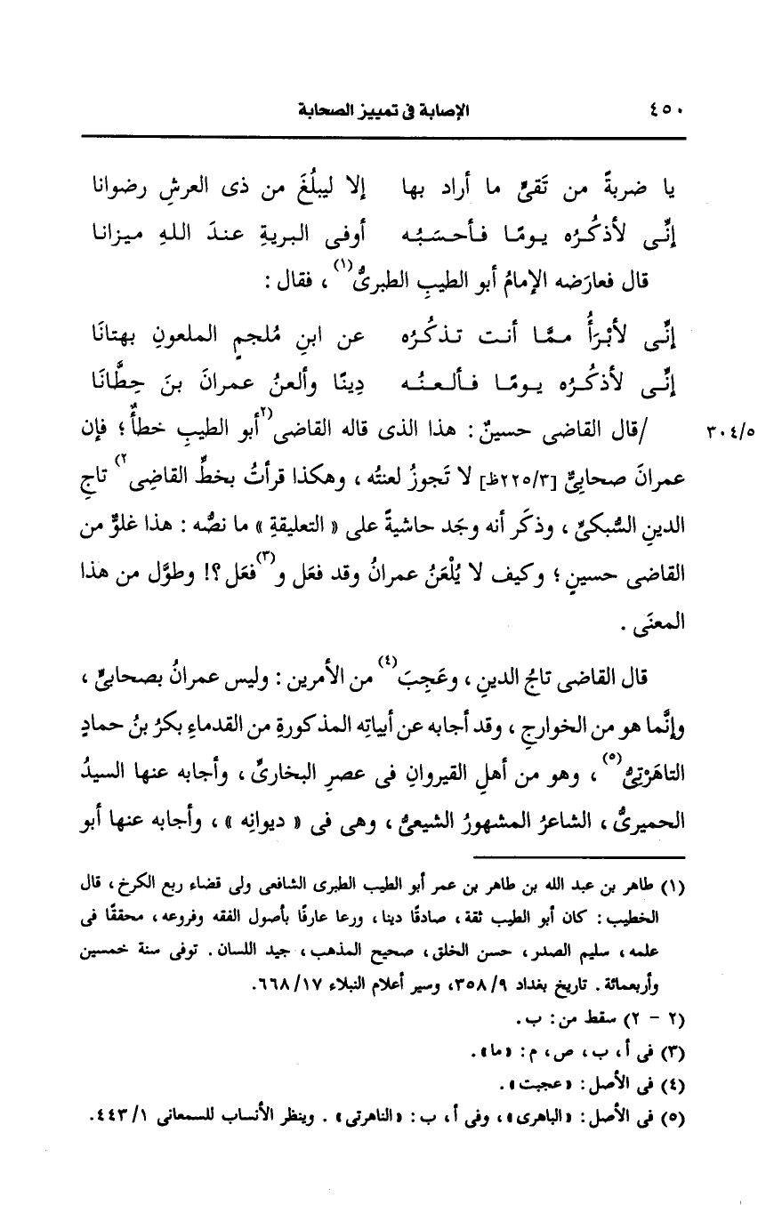 قال القاضي تاج الدين وعجب من الأمرين وليس عمران صحابيا وانما هو من الخوارج وقد إجابة، عَن أبياته المذكورة من القدماء بكر بن حماد التاهرتي وهو من أهل القيروان في عصر البُخارِيّ وأجاب عنها السيد الحميري الشاعر المشهور الشيعي وهي في ديوأنه واجابه عنها أَبو المظفر الشهد ستأتي في كتابه التبصير.