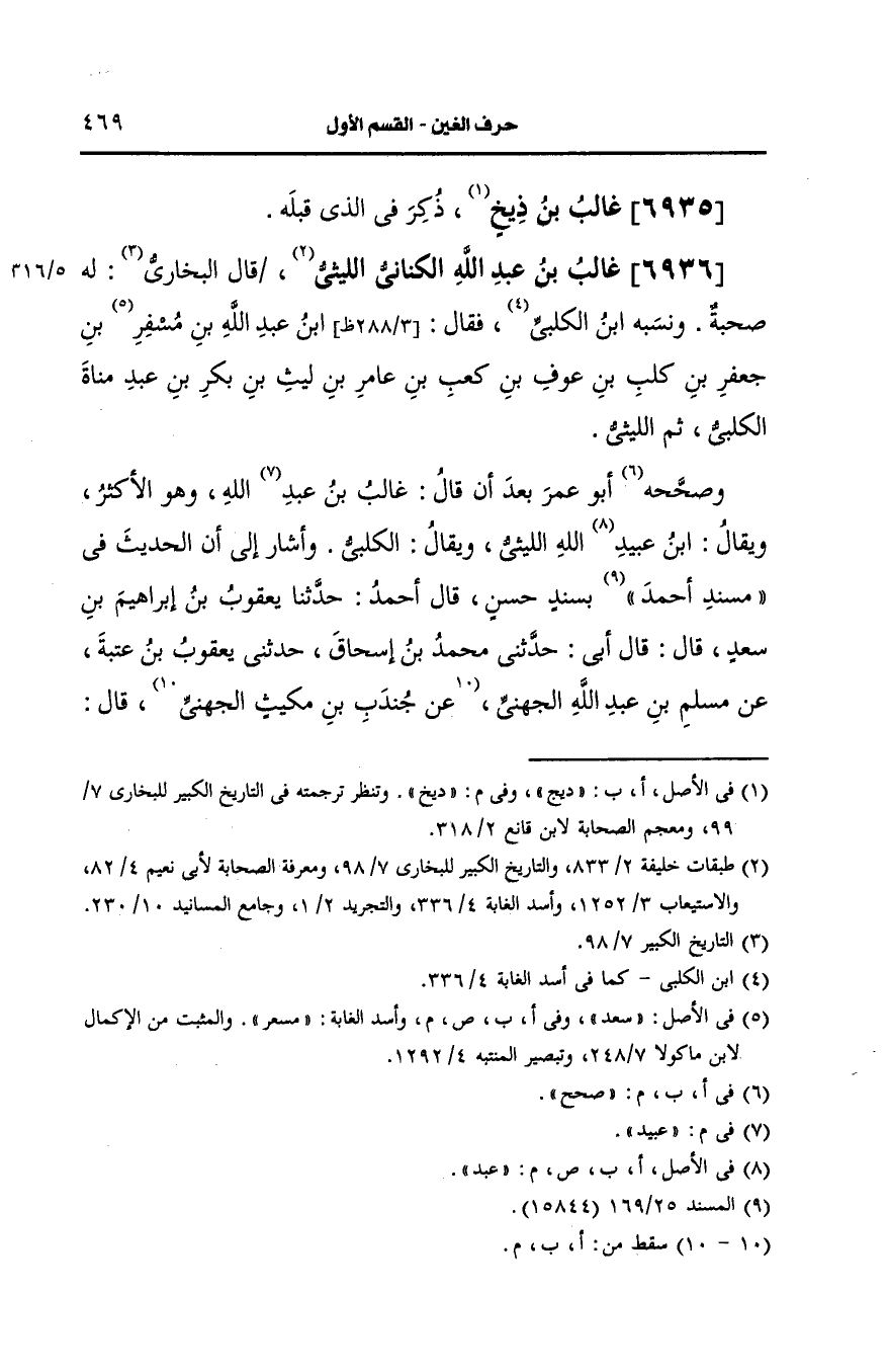 وصحح أَبو عمر بعد ان قال غالب بن عبيد الله وهو الأكثر، ويُقال: بن عبيد الله الليثي، ويُقال: الكلبي وأشار إلى ان الحديث في مسند أَحمد بسند حسن.