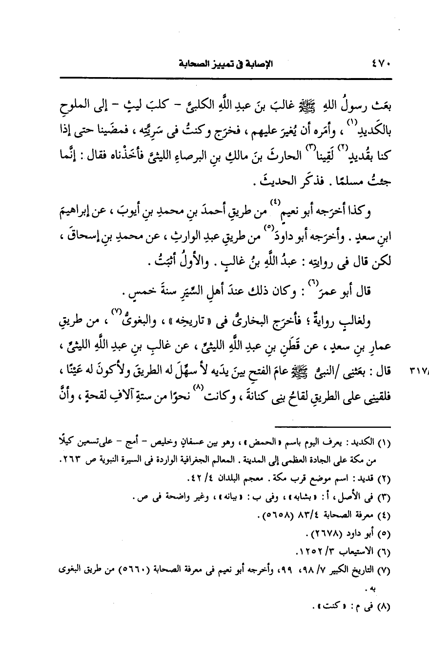 ولغالب رواية فاخرج البُخارِيّ، في "تاريخه" والبغوي من طريق عمار ابن سَعد، عَن قطن بن عَبد الله الليثي، عَن غالب بن عَبد الله الليثي قال بعثني النَّبيّ صَلى الله عَلَيه وسَلم عام الفتح بين يديه لا سهل له الطريق ولاكون له عينا فلقيني على الطريق لقاح بني كنانة وكنت نحوا من ستة آلاف لقحة وأَنَّ النَّبِيَّ صَلى الله عَلَيه وسَلم نزل فحلبت له فجعل يدعو الناس إلى الشراب فمن قال اني صائم قال هؤلاء العاصون.