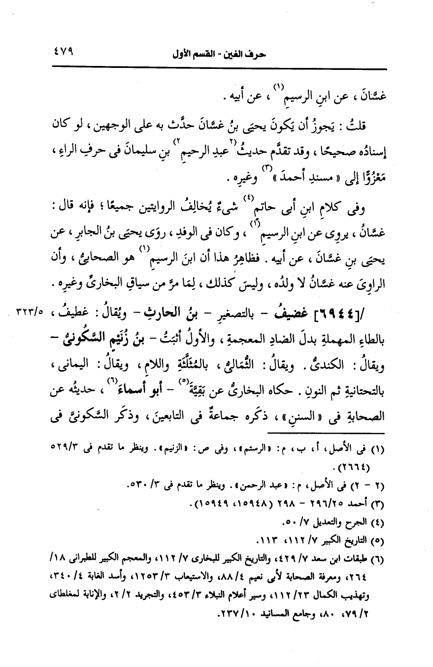 حديثه، عَن الصحابة في السُّنَن ذكره جماعة في التابعين وذكر السكوني في الصحابة البُخارِيّ، وابن أبي حاتم والتِّرمِذيّ وخليفة، وابن أبي خيثمة والطبراني وآخرون.