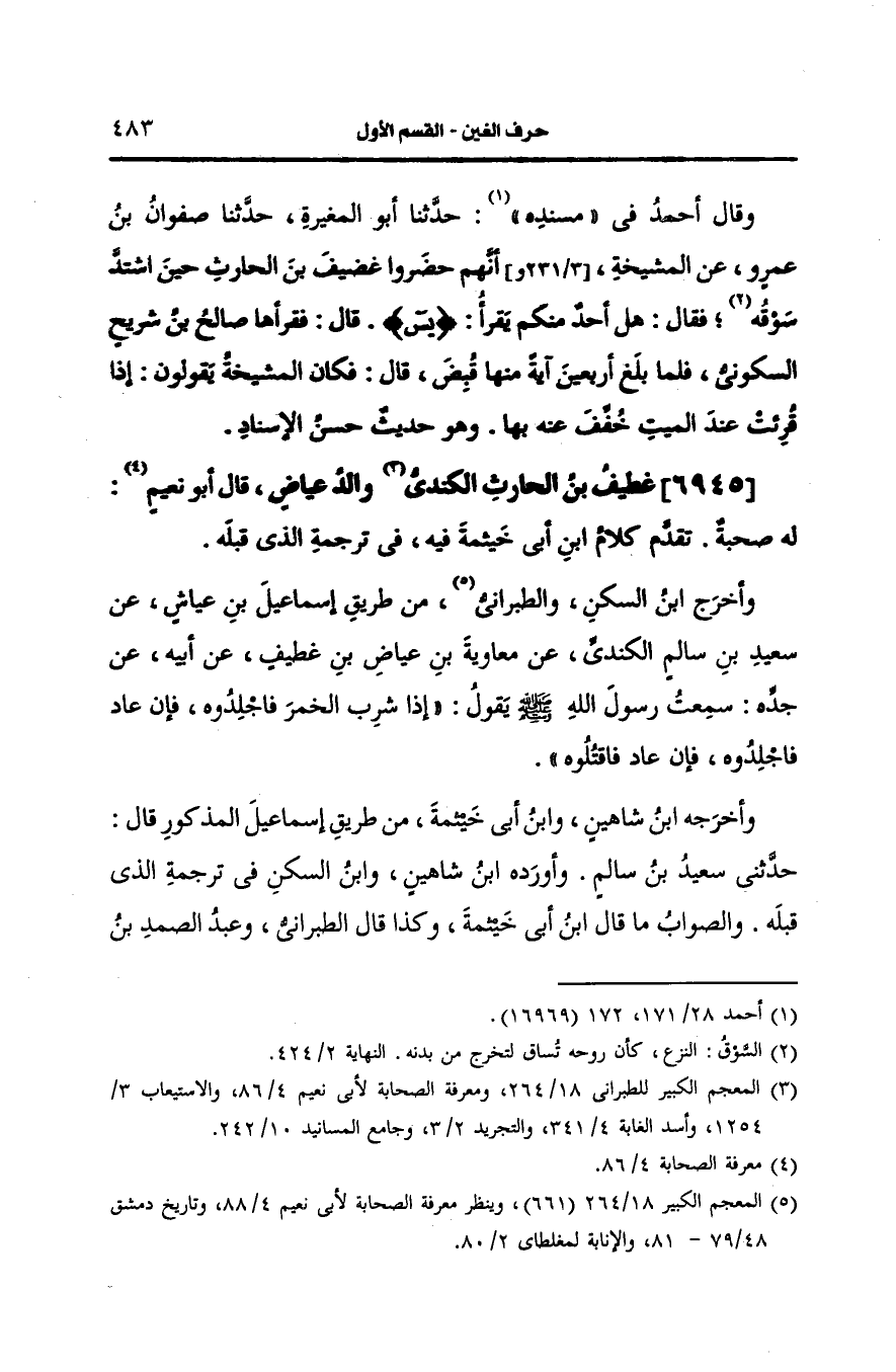 وأخرج له بن السَّكَن والطبراني من طريق إسماعيل بن عياش، عَن سعيد بن سالم الكندي، عَن معاوية بن عياض بن غطيف، عَن أَبيه، عَن جَدِّه سمعت رسول الله صَلى الله عَلَيه وسَلم يقول إذا شرب الخمر فاجلدوه فان عاد فاجلدوه فان عاد فاقتلوه.