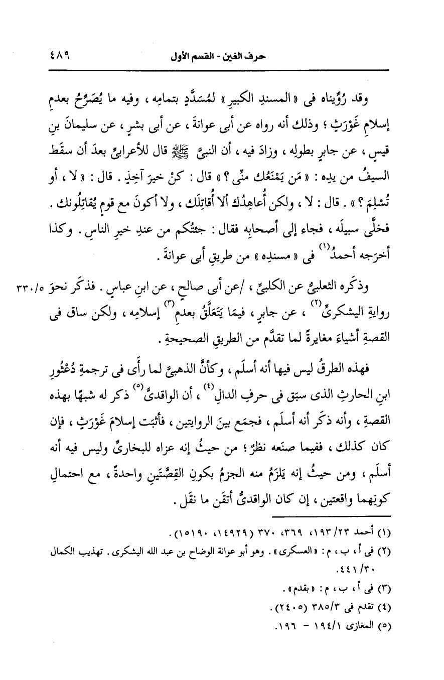 فهذه الطرق ليس فيها أنه اسلم وكأن الذهبي لما رأى ما في ترجمة دعثور بن الحارث الذي سبق في حرف الدال ان الواقدي ذكر له شبها بهذه القصة وأنه ذكر أنه اسلم فجمع بين الروايتين فأثبت إسلام غورث فان كان كذلك ففيما صنعه نظر من حيث أنه عزاه للبخاري وليس فيه أنه اسلم ومن حيث أنه يلزم منه الجزم يكون القصتين واحدة مع احتمال كونهما واقعتين ان كان الواقدي أتقن ما نقل.