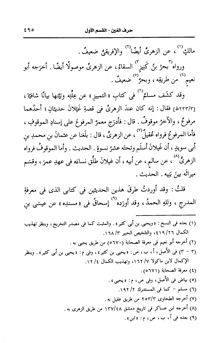 وقد كشف مسلم في كتاب التمييز، عَن علته وبينها بيانا شافيا فقال أنه كان عند الزُّهْرِيّ في قصة غيلان حديثان أحدهما مرفوع والآخر موقوف قال فادرج معمر المرفوع على إسناد الموقوف فاما المرفوع فرواه عُقَيل، عَن الزُّهْرِيّ قال بلغنا، عَن عثمان بن محمد بن أبي سويد ان غيلان اسلم وتحته عشر نسوة الحديث وأما الموقوف فرواه الزُّهْرِيّ، عَن سالم، عَن أَبيه ان غيلان طلق نساءه في عهد عمر وقسم ميراثه بين بنيه الحديث.