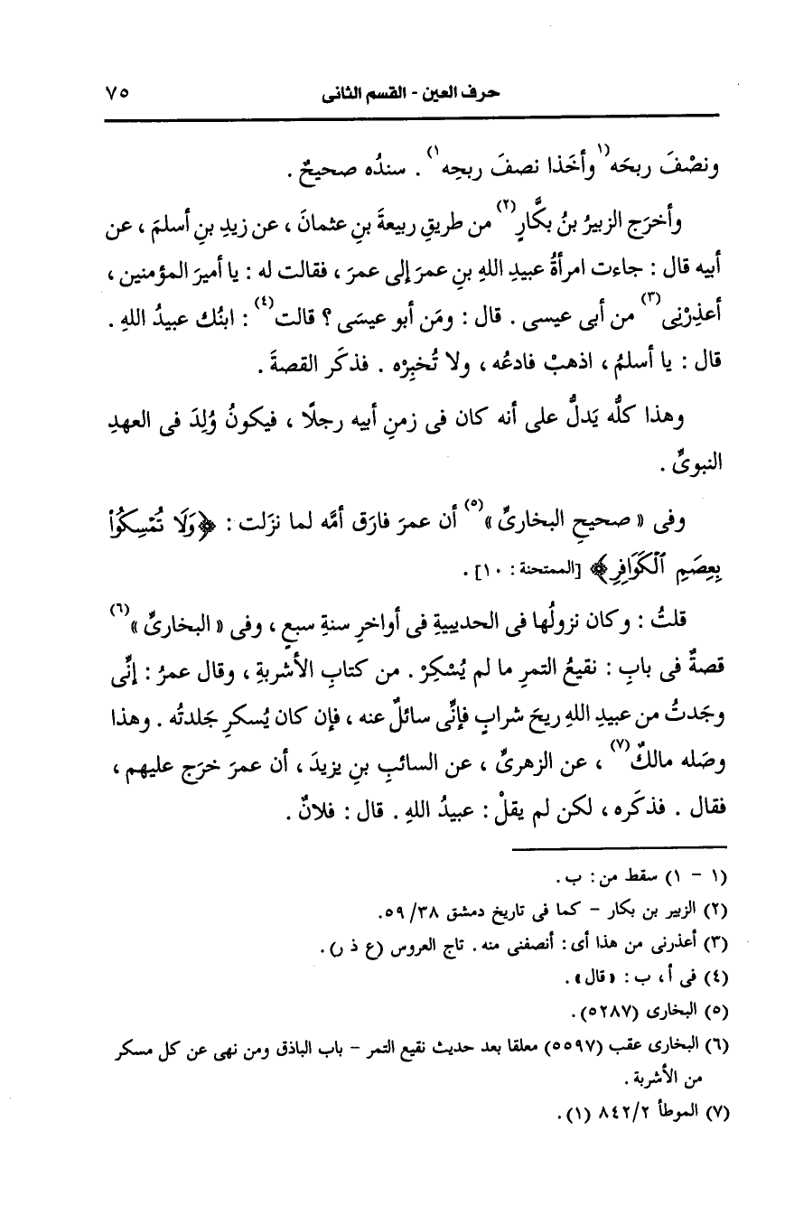 وأخرج الزبير بن بكار من طريق ربيعة بن عثمان، عَن زيد بن اسلم، عَن أَبيه قال جاءت امرأة عبيد الله بن عمر إلى عمر فقالت له يا أمير المؤمنين اعذرني من أبي عسيى قال ومن أَبو عيسى قالت ابنك عبيد الله قال يا اسلم اذهب فادعه ولا تخبره فذكر القصة.