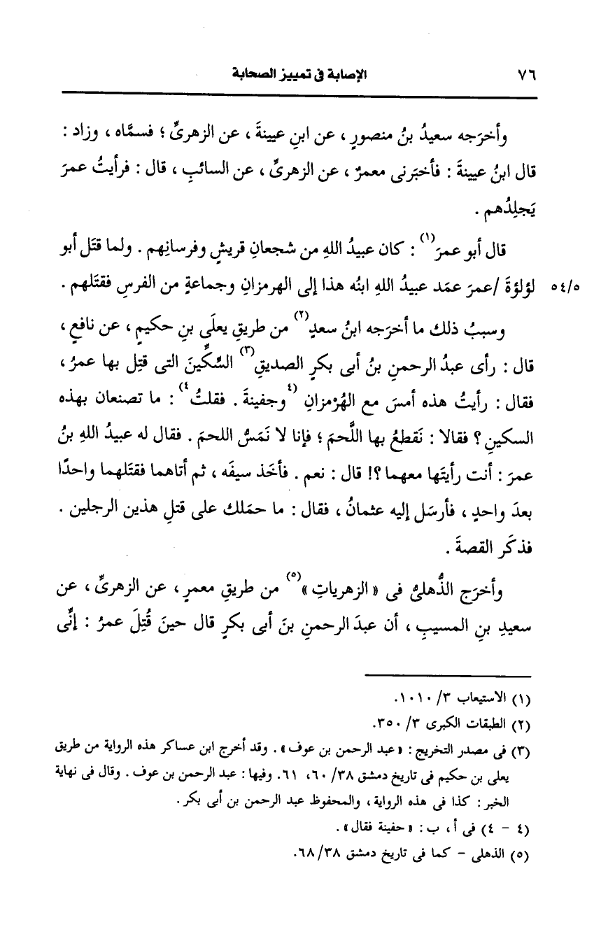 وأخرج الذهلي في الزُّهْرِيّات من طريق معمر، عَن الزُّهْرِيّ، عَن سعيد بن المسيب ان عبد الرحمن بن أبي بكر قال حين قتل عمر اني انتهيت إلى الهرمزان وجفينة وأبي لؤلؤة وهم نجي فنفروا منى فسقط من بينهم خنجر له رأسان نصابه في وسطه فانظروا.