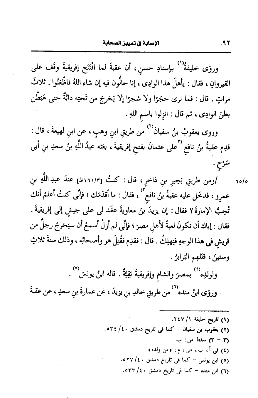 ومن طريق بحير بن ذاخر قال كنت عند عَبد الله بن عَمرو فدخل عليه عقبة بن نافع فقال ما اقدمك فاني كنت اعلم انك تحب الامارة فقال ان يزيد بن معاوية عقد لي على جيش إلى إفريقية فقال إياك ان تكون لعبة لأهل مصر فاني لم أزل اسمع ان سيخرج رجل من قريش في هذا الوجه فيهلك قال فقدم فقتل هو وأصحابه وذلك سنة ثلاث وستين قتلهم البرابرة.