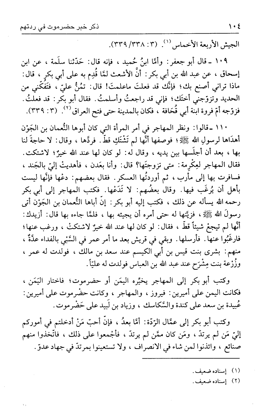 ١٠٩ - قال أبو جعفر: وأمَّا ابنُ حُميد، فإنه قال: حَدّثنا سلَمة، عن ابن إسحاق، عن عبد الله بن أبي بكر: أنَّ الأشعث لمَّا قُدِم به على أبي بكر، قال: ماذا تراني أصنع بك؛ فإنَّك قد فعلتَ ماعلمتَ! قال: تمُنُّ عليّ، فتَفُكني من الحديد وتزوّجني أختَك؛ فإني قد راجعتُ وأسلمتُ. فقال أبو بكر: قد فعلتُ. فزوّجه أمّ فروة ابنة أبي قُحَافة، فكان بالمدينة حتى فتح العراق (٢). (٣: ٣٣٩).