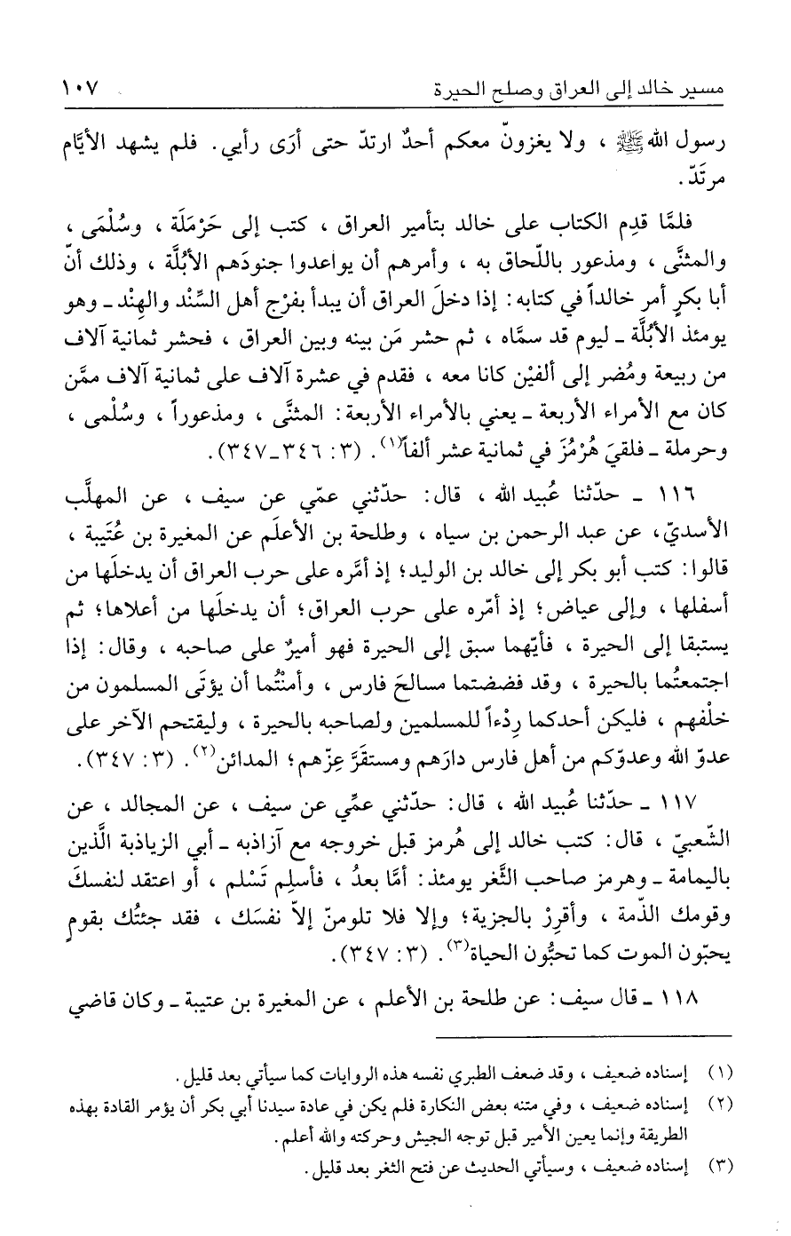 ١١٧ - حدّثنا عُبيد الله، قال: حدّثني عمِّي عن سيف، عن المجالد، عن الشّعبيّ، قال: كتب خالد إلى هُرمز قبل خروجه مع آزاذبه -أبي الزياذبة الَّذين باليمامة- وهرمز صاحب الثَّغر يومئذ: أمَّا بعدُ، فأسلِم تَسْلم، أو اعتقد لنفسكَ وقومك الذّمة، وأقرِرْ بالجزية؛ وإلا فلا تلومنّ إلّا نفسَك، فقد جئتُك بقومٍ يحبون الموت كما تحبُّون الحياة (٣). (٣: ٣٤٧).