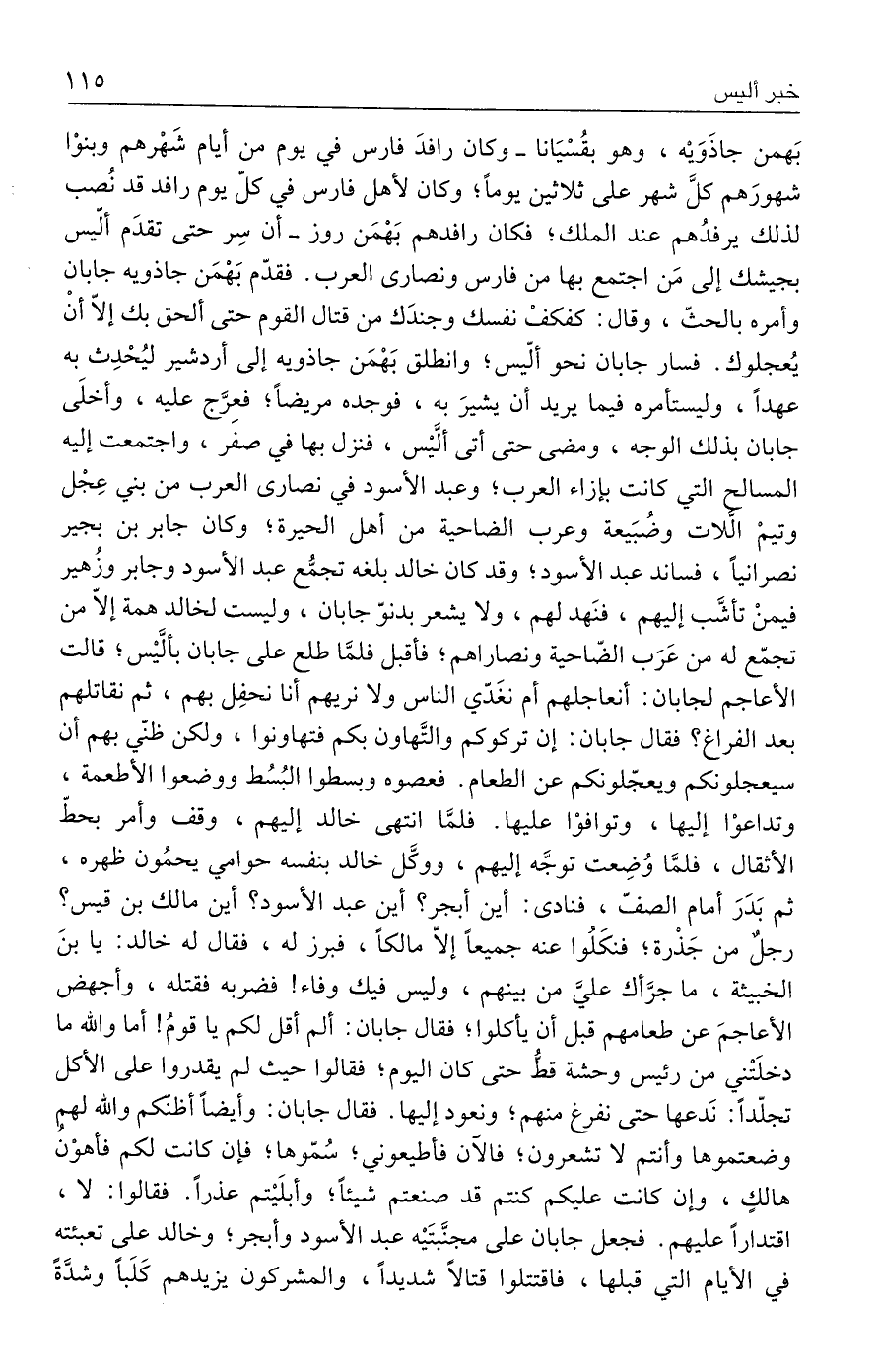 بَهمن جاذَوَيْه، وهو بقُسْيَانا -وكان رافدَ فارس في يوم كمن أيام شَهْرهم وبنوْا شهورَهم كلَّ شهر على ثلاثين يومًا، وكان لأهل فارس في كلّ يوم رافد قد نُصب لذلك يرفدُهم عند الملك، فكان رافدهم بَهْمَن روز- أن سِر حتى تقدَم ألّيس بجيشك إلى مَن اجتمع بها من فارس ونصارى العرب. فقدّم بَهْمَن جاذويه جابان وأمره بالحثّ، وقال: كفكفْ نفسك وجندَك من قتال القوم حتى ألحق بك إلّا أنْ يُعجلوك. فسار جابان نحو ألّيس؛ وانطلق بَهْمَن جاذويه إلى أردشير ليُحْدِث به عهدًا، وليستأمره فيما يريد أن يشيرَ به، فوجده مريضًا؛ فعرَّج عليه، وأخلَى جابان بذلك الوجه، ومضى حتى أتى أليْس، فنزل بها في صفَر، واجتمعت إليه المسالح التي كانت بإزاء العرب؛ وعبد الأسود في نصارى العرب من بني عِجْل وتيمْ اللات وضُبَيعة وعرب الضاحية من أهل الحيرة؛ وكان جابر بن بجير نصرانيًا، فساند عبد الأسود؛ وقد كان خالد بلغه تجمُّع عبد الأسود وجابر وزُهير فيمنْ تأشَب إليهم، فنَهد لهم، ولا يشعر بدنوّ جابان، وليست لخالد همة إلّا من تجمّع له من عَرَب الضّاحية ونصاراهم؛ فأقبل فلمَّا طلع على جابان بأليْس؛ قالت الأعاجم لجابان: أنعاجلهم أم نغَدّي الناس ولا نريهم أنا نحفِل بهم، ثم نقاتلهم بعد الفراغ؟ فقال جابان: إن تركوكم والتَّهاون بكم فتهاونوا، ولكن ظنّي بهم أن سيعجلونكم ويعجّلونكم عن الطعام. فعصوه وبسطوا البُسُط ووضعوا الأطعمة، وتداعوْا إليها، وتوافوْا عليها. فلمَّا انتهى خالد إليهم، وقف وأمر بحطّ الأثقال، فلمَّا وُضِعت توجَّه إليهم، ووكَّل خالد بنفسه حوامي يحمُون ظهره، ثم بَدَرَ أمام الصفّ، فنادى: أين أبجر؟ أين عبد الأسود؟ أين مالك بن قيس؟ رجلٌ من جَذْرة؛ فنكَلُوا عنه جميعًا إلّا مالكًا، فبرز له، فقال له خالد: يا بنَ الخبيثة، ما جرَّأك على من بينهم، وليس فيك وفاء! فضربه فقتله، وأجهض الأعاجمَ عن طعامهم قبل أن يأكلوا؛ فقال جابان: ألم أقل لكم يا قومُ! أما والله ما دخلَتْني من رئيس وحشة قطُ حتى كان اليوم؛ فقالوا حيث لم يقدروا على الأكل تجلّدًا: نَدعها حتى نفرغ منهم، ونعود إليها. فقال جابان: وأيضًا أظنكم والله لهم وضعتموها وأنتم لا تشعرون؛ فالآن فأطيعوني؛ سُمّوها؛ فإن كانت لكم فأهوْنُ هالكٍ، وإن كانت عليكم كنتم قد صنعتم شيئًا؛ وأبلَيْتم عذرًا. فقالوا: لا، اقتدارًا عليهم. فجعل جابان على مجنَّبتَيْه عبد الأسود وأبجر؛ وخالد على تعبئته في الأيام التي قبلها، فاقتتلوا قتالًا شديدًا، والمشركون يزيدهم كَلَبًا وشدَّةً