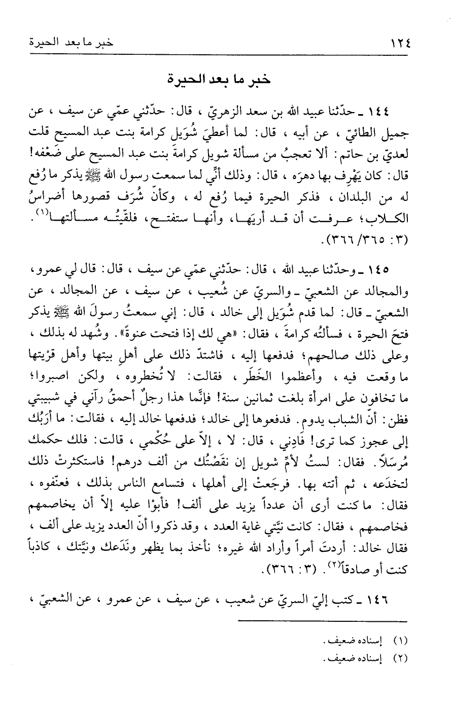 ١٤٥ - وحدّثنا عبيد الله، قال: حدّثني عمّي عن سيف، قال: قال لي عمرو، والمجالد عن الشعبيّ -والسريّ عن شُعيب، عن سيف، عن المجالد، عن الشعبيّ- قال: لما قدم شُوَيل إلى خالد، قال: إني سمعتُ رسولَ الله - صلى الله عليه وسلم - يذكر فتحَ الحيرة، فسألتُه كرامةَ، فقال: "هي لك إذا فتحت عنوةً". وشُهد له بذلك، وعلى ذلك صالحهم؛ فدفعها إليه، فاشتدّ ذلك على أهلِ بيتها وأهل قرْيتها ما وقعت فيه، وأعظموا الخَطَر، فقالت: لا تُخطروه، ولكن اصبروا؛ ما تخافون على امرأة بلغت ثمانين سنة! فإنَّما هذا رجلٌ أحمقُ رآني في شبيبتي فظن: أنّ الشباب يدوم. فدفعوها إلى خالد؛ فدفعها خالد إليه، فقالت: ما أرَبُك إلى عجوز كما ترى! فادِني، قال: لا، إلّا على حُكْمي، قالت: فلك حكمك مُرسَلًا. فقال: لستُ لأمِّ شويل إن نقَصْتُك من ألف درهم! فاستكثرتْ ذلك لتخدَعه، ثم أتته بها. فرجَعتْ إلى أهلها، فتسامع الناس بذلك، فعنّفوه، فقال: ما كنت أرى أن عددًا يزيد على ألف! فأبوْا عليه إلّا أن يخاصمهم فخاصمهم، فقال: كانت نيَّتي غاية العدد، وقد ذكروا أنّ العدد يزيد على ألف، فقال خالد: أردتَ أمرًا وأراد الله غيره؛ نأخذ بما يظهر ونَدَعك ونيَّتك، كاذبًا كنت أو صادقًا (٢). (٣: ٣٦٦).