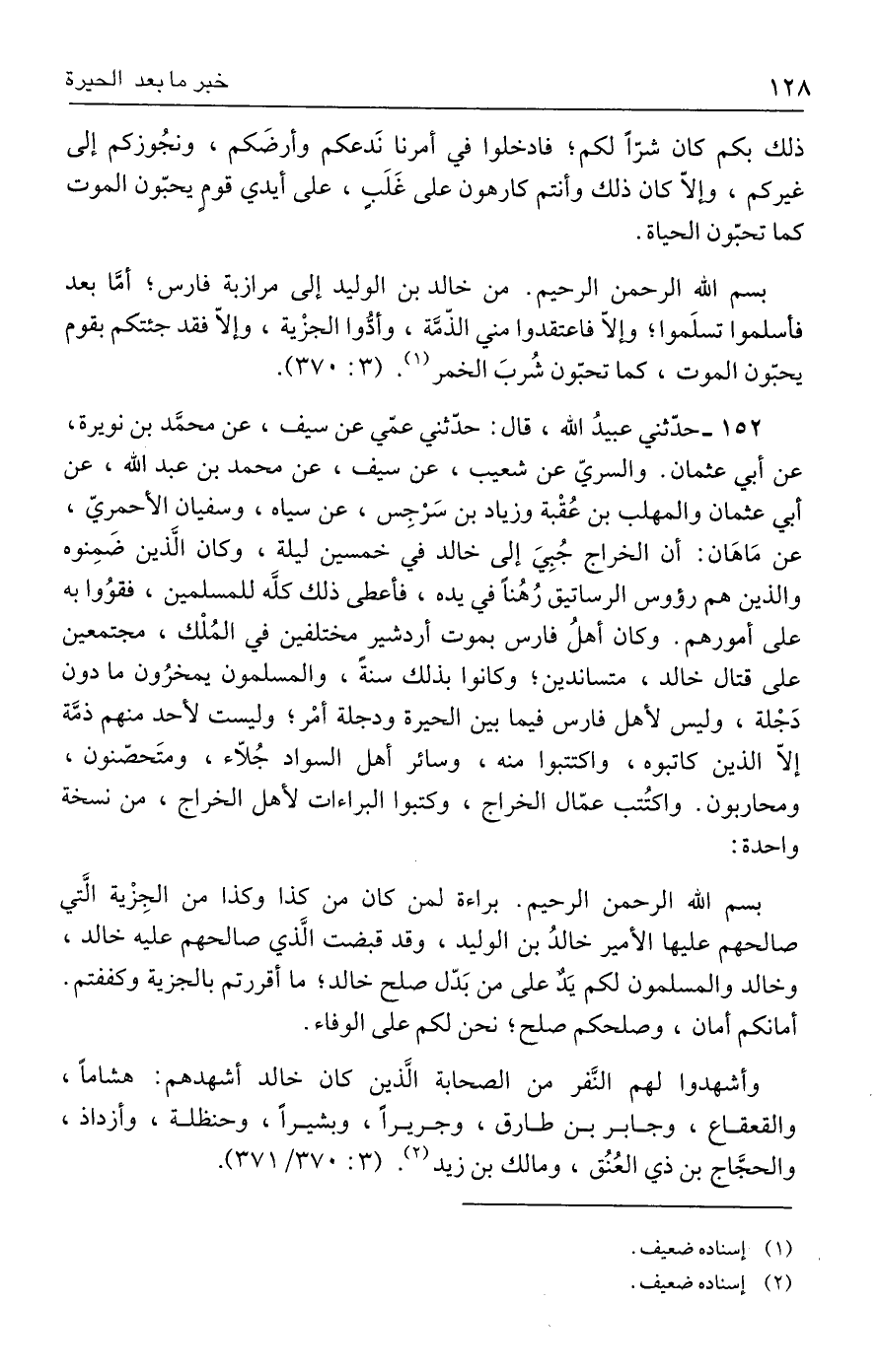 بسم الله الرحمن الرحيم. من خالد بن الوليد إلى مرازبة فارس؛ أمَّا بعد فأسلموا تسلَموا؛ وإلّا فاعتقدوا مني الذّمَّة، وأدُّوا الجزْية، وإلّا فقد جئتكم بقوم يحبّون الموت، كما تحبّون شُربَ الخمر (١). (٣: ٣٧٠).