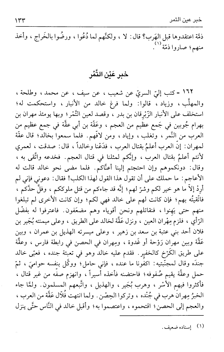 ١٦٢ - كتب إليّ السريّ عن شعيب، عن سيف، عن محمد، وطلحة، والمهلَّب، وزياد، قالوا: ولما فرغ خالد من الأنبار، واستحكمت له؛ استخلف على الأنبار الزّبْرِقان بن بدر، وقصد لعين التَّمْر؛ وبها يومئذ مهران بن بهرام جُوبين في جَمع عظيم من العجم، وعَقّة بن أبي عقَّة في جمع عظيم من العرب من النَّمر، وتغلب، وإياد، ومن لافّهم. فلما سمعوا بخالد؛ قال عقّة لمهران: إنّ العرب أعلمُ بقتال العرب، فدَعْنا وخالداً، قال: صدقت، لعمري لأنتم أعلمُ بقتال العرب، وإنَّكم لمثلنا في قتال العجم. فخدعه واتَّقى به، وقال: دونكموهم وإن احتجتم إلينا أعنَّاكم. فلما مضى نحو خالد قالت له الأعاجم: ما حملك على أن تقول هذا القول لهذا الكلب! فقال: دعوني فإني لم أرِدْ إلاّ ما هو خير لكم وشرّ لهم، إنَّه قد جاءكم من قتل ملوككم، وفلَّ حدَّكم، فاتّقيتُه بهم؛ فإن كانت لهم على خالد فهي لكم؛ وإن كانت الأخرى لم تبلغوا منهم حتى يَهِنوا، فنقاتلهم ونحن أقوياء وهم مضعَفون. فاعترفوا له بفضْل الرّأي، فلزم مِهْران العين، ونزل عَقَّة لخالد على الطريق، وعلى ميمنته بُجَير بن فلان أحد بني عتبة بن سعد بن زهير، وعلى ميسرته الهذيل بن عمران، وبينٍ عَقَّة وبين مهران رَوْحة أو غَدوة، ومِهران في الحصن في رابطة فارس، وعقَّة على طريق الكَرْخ كالخفير. فقدم عليه خالد وهو في تعبئة جنده، فعبّى خالد جندَه وقال لمجنّبتيه: اكفُونا ما عنده، فإني حامل؛ ووكَّل بنفسه حواميَ، ثمّ حمل وعقَّة يقيم صفوفه، فاحتضنه فأخذه أسيراً، وانهزم صفّه من غير قتال، فأكثروا فيهِم الأسْر، وهرب بُجَير، والهذيل، واتَّبعهم المسلمون. ولمَّا جاء الخبرُ مِهران هرب في جُنْده، وتركوا الحِصْن. ولما انتهت فُلاّل عَقَّة من العرب، والعجم إلى الحصن؛ اقتحموه، واعتصموا به؛ وأقبل خالد في النَّاس حتَّى ينزل