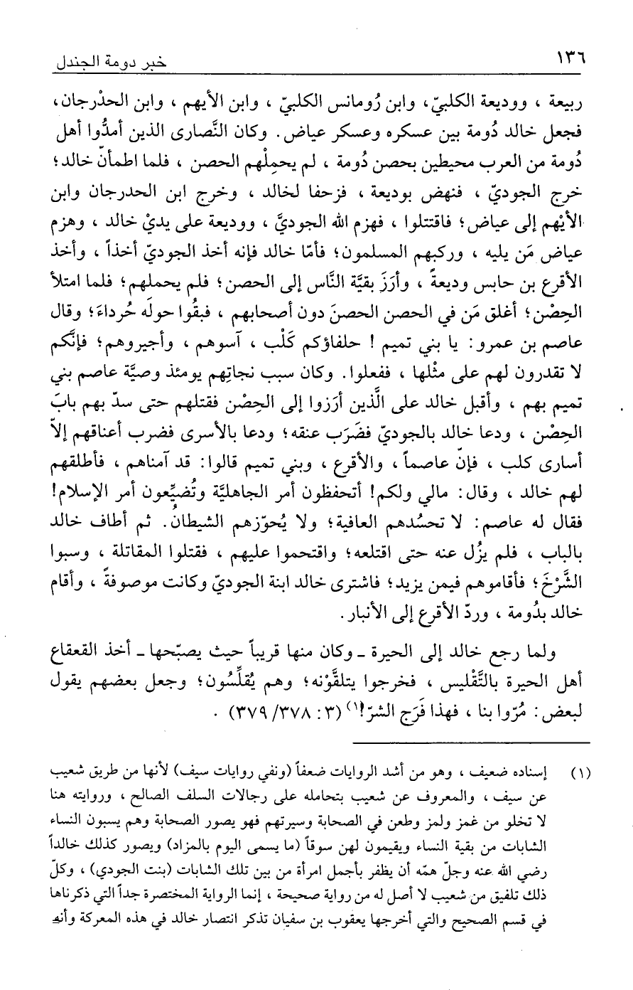 (١) إسناده ضعيف، وهو من أشد الروايات ضعفًا (ونفي روايات سيف) لأنها من طريق شعيب عن سيف، والمعروف عن شعيب بتحامله على رجالات السلف الصالح، وروايته هنا لا تخلو من غمز ولمز وطعن في الصحابة وسيرتهم فهو يصور الصحابة وهم يسبون النساء الشابات من بقية النساء ويقيمون لهن سوقًا (ما يسمى اليوم بالمزاد) ويصور كذلك خالدًا رضي الله عنه وجلّ همّه أن يظفر بأجمل امرأة من بين تلك الشابات (بنت الجودي)، وكلّ ذلك تلفيق من شعيب لا أصل له من رواية صحيحة، إنما الرواية المختصرة جدًا التي ذكرناها في قسم الصحيح والتي أخرجها يعقوب بن سفيان تذكر انتصار خالد في هذه المعركة وأنه =