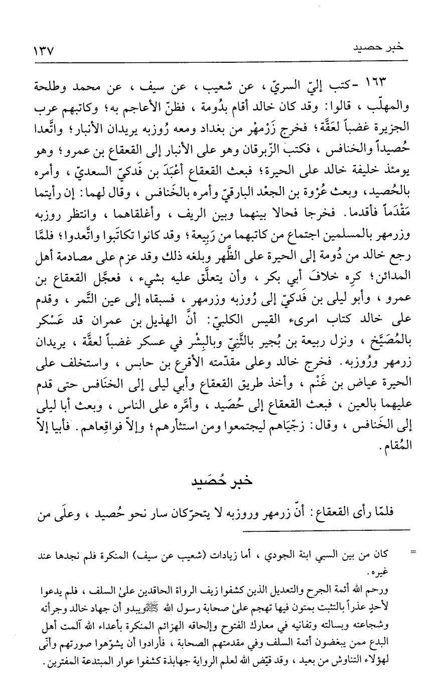 ١٦٣ - كتب إليّ السريّ، عن شعيب، عن سيف، عن محمد وطلحة والمهلّب، قالوا: وقد كان خالد أقام بدُومة، فظنّ الأعاجم به؛ وكاتبهم عرب الجزيرة غضبًا لعَقَّة؛ فخرج زَرْمهْر من بغداد ومعه رُوزبه يريدان الأنبار؛ واتَّعدا حُصيدًا والخنافس، فكتب الزّبرقان وهو على الأنبار إلى القعقاع بن عمرو؛ وهو يومئذ خليفة خالد على الحيرة؛ فبعث القعقاع أعْبَدَ بن فَدكيّ السعديّ، وأمره بالحُصيد، وبعث عُرْوة بن الجعْد البارقيّ وأمره بالخَنافس، وقال لهما: إن رأيتما مَقْدَمًا فأقدما. فخرجا فحالا بينهما وبين الريف، وأغلقاهما، وانتظر روزبه وزرمهر بالمسلمين اجتماع من كاتبهما من رَبِيعة؛ وقد كانوا تكاتَبوا واتَّعدوا؛ فلمَّا رجع خالد من دُومة إلى الحيرة على الطهر وبلغه ذلك وقد عزم على مصادمة أهل المدائن؛ كرِه خلافَ أبي بكر، وأن يتعلَّق عليه بشيء، فعجَّل القعقاع بن عمرو، وأبو ليلى بن فَدكيّ إلى رُوزبه وزرمهر، فسبقاه إلى عين التَّمر، وقدم على خالد كتاب امرئ القيس الكلبيّ: أنَّ الهذيل بن عمران قد عَسْكر بالمُصَيَّخ، ونزل ربيعة بن بُجير بالثَنِيّ وبالبِشْر في عسكر غضبًا لعقَّة، يريدان زرمهر ورُوزبه. فخرج خالد وعلى مقدّمته الأقرع بن حابس، واستخلف على الحيرة عياض بن غَنْم، وأخذ طريق القعقاع وأبي ليلى إلى الخنَافس حتى قدم عليهما بالعين، فبعث القعقاع إلى حُصَيد، وأمَّره على الناس، وبعث أبا ليلى إلى الخَنافس، وقال: زجّيَاهم ليجتمعوا ومن استثأرهم؛ وإلّا فواقِعاهم. فأبيا إلّا المُقام.