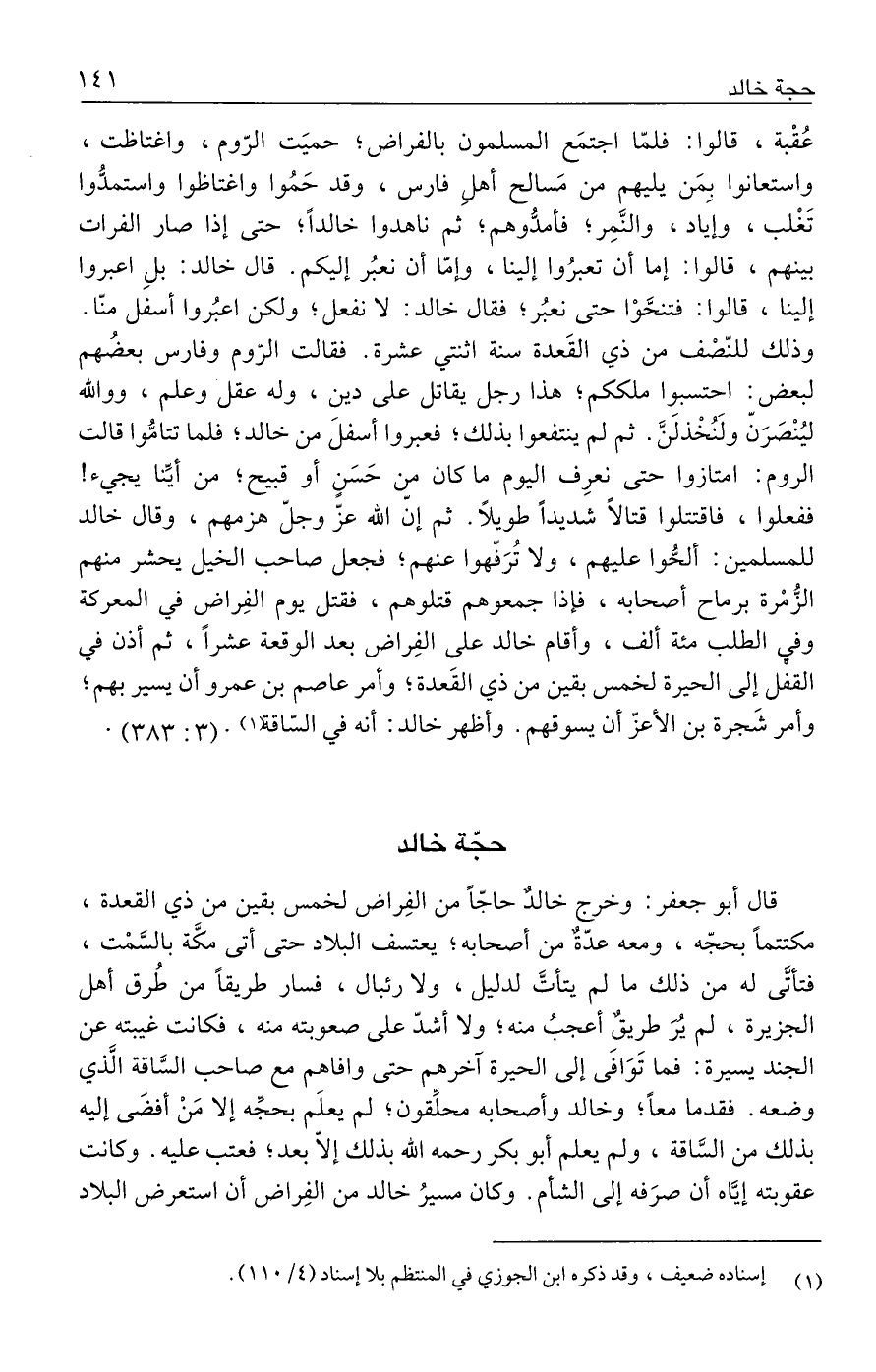 قال أبو جعفر: وخرج خالدٌ حاجًّا من الفِراض لخمس بقين من ذي القعدة، مكتتمًا بحجّه، ومعه عدّةٌ من أصحابه؛ يعتسف البلاد حتى أتى مكَّة بالسَّمْت، فتأتَّى له من ذلك ما لم يتأتَّ لدليل، ولا رئبال، فسار طريقًا من طُرق أهل الجزيرة، لم يُرَ طريقٌ أعجبُ منه؛ ولا أشدّ على صعوبته منه، فكانت غيبته عن الجند يسيرة: فما تَوَافَى إلى الحيرة آخرهم حتى وافاهم مع صاحب السَّاقة الَّذي وضعه. فقدما معًا؛ وخالد وأصحابه محلِّقون؛ لم يعلَم بحجِّه إلا مَنْ أفضى إليه بذلك من السَّاقة، ولم يعلم أبو بكر رحمه الله بذلك إلّا بعد؛ فعتب عليه. وكانت عقوبته إيَّاه أن صرَفه إلى الشأم. وكان مسيرُ خالد من الفِراض أن استعرض البلاد