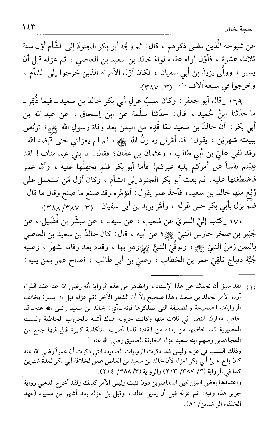 (١) لقد سبق أن تحدثنا عن هذا الإسناد، والظاهر من هذه الرواية أنه رضي الله عنه عقد اللواء أول الأمر لخالد بن سعيد وهذا صحيح إلأ أن الشطر الآخر (ثم عزله قبل أن يسير) يخالف الروايات الصحيحة والضعيفة التي سنذكرها فإنه - أي: خالد بن سعيد رضي الله عنه - قد خاض معارك انتصر في ثلاث منها وكانت حروبه هناك أشبه بالحروب الخاطفة وليست المصيرية كما خاضها من بعده من القادة فلما أصيب بانتكاسة كبيرة قتل فيها جمع من المجاهدين ومنهم ابنه سعيد عزله الخليفة الصديق رضي الله عنه.