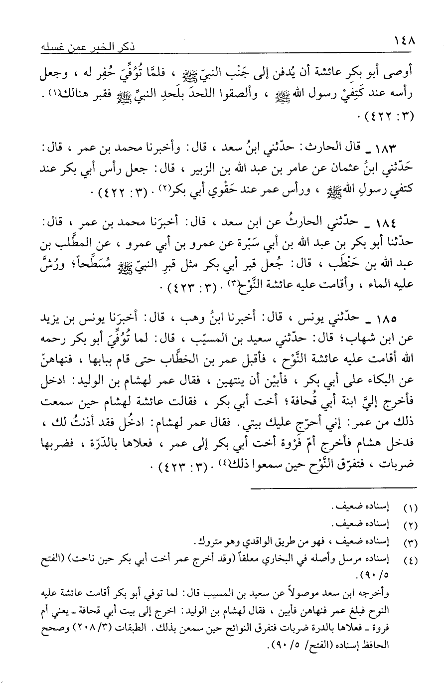 ١٨٤ - حدّثني الحارثُ عن ابن سعد، قال: أخبرَنا محمد بن عمر، قال: حدّثنا أبو بكر بن عبد الله بن أبي سبْرة عن عمرو بن أبي عمرو، عن المطَّلب بن عبد الله بن حَنْطَب، قال: جُعل قبر أبي بكر مثل قبرِ النبيّ - صلى الله عليه وسلم - مُسَطَّحًا؛ ورُشَّ عليه الماء، وأقامت عليه عائشة النَّوْح (٣). (٣: ٤٢٣).