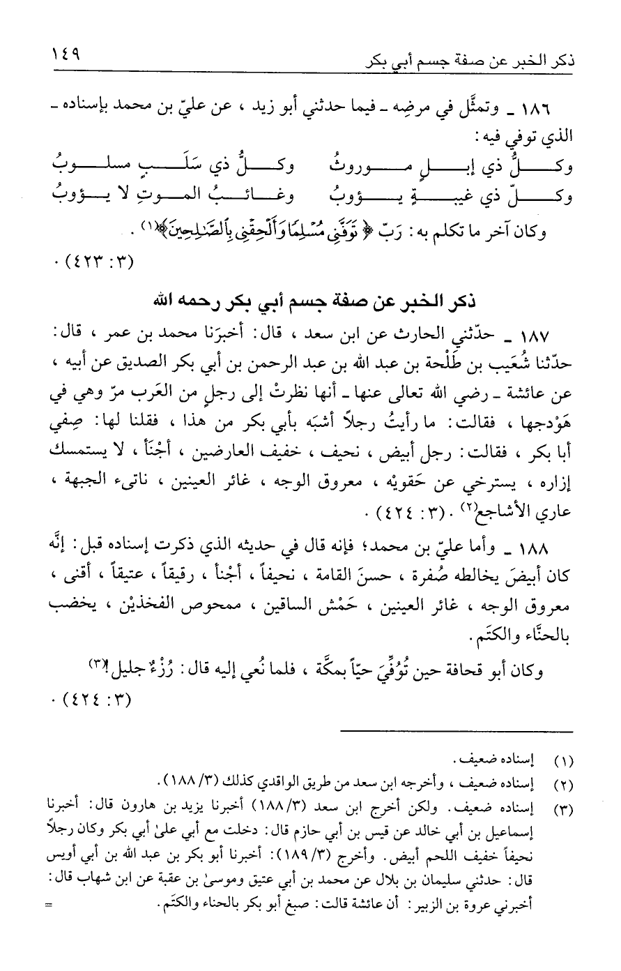 ١٨٧ - حدّثني الحارث عن ابن سعد، قال: أخبرَنا محمد بن عمر، قال: حدّثنا شُعَيب بن طَلْحة بن عبد الله بن عبد الرحمن بن أبي بكر الصديق عن أبيه، عن عائشة - رضي الله تعالى عنها - أنها نظرتْ إلى رجلٍ من العَرب مرّ وهي في هَوْدجها، فقالت: ما رأيتُ رجلًا أشبَه بأبي بكر من هذا، فقلنا لها: صِفي أبا بكر، فقالت: رجل أبيض، نحيف، خفيف العارضين، أجْنَأ، لا يستمسك إزاره، يسترخي عن حَقويْه، معروق الوجه، غائر العينين، ناتئ الجبهة، عاري الأشاجع (٢). (٣: ٤٢٤).