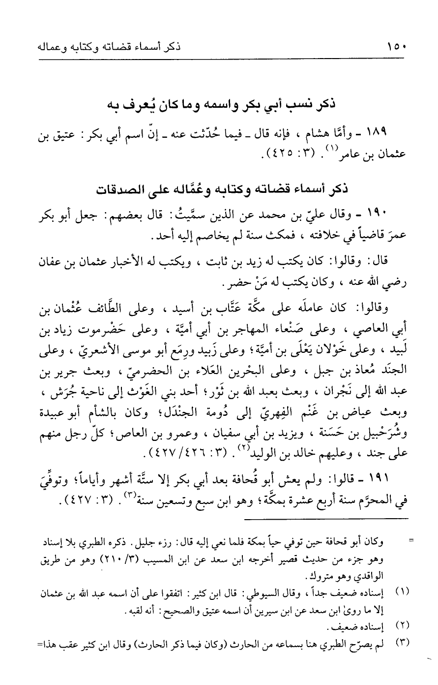 ١٨٩ - وأمَّا هشام، فإنه قال - فيما حُدّثت عنه - إنّ اسم أبي بكر: عتيق بن عثمان بن عامر (١). (٣: ٤٢٥).