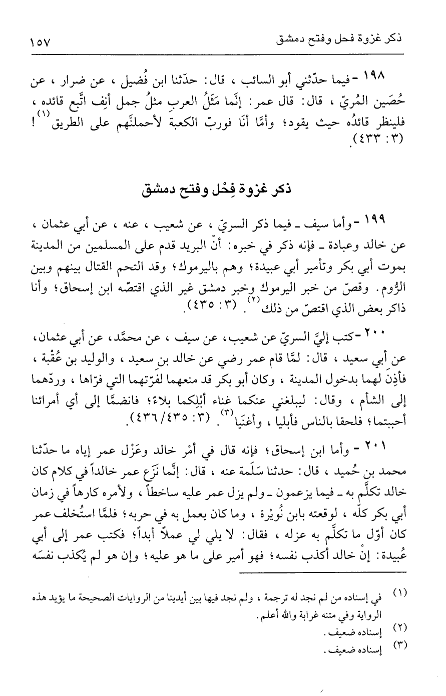 ١٩٩ - وأما سيف - فيما ذكر السريّ، عن شعيب، عنه، عن أبي عثمان، عن خالد وعبادة - فإنه ذكر في خبره: أنّ البريد قدم على المسلمين من المدينة بموت أبي بكر وتأمير أبي عبيدة؛ وهم باليرموك؛ وقد التحم القتال بينهم وبين الرُّوم. وقصّ من خبر اليرموك وخبر دمشق غير الذي اقتصّه ابن إسحاق؛ وأنا ذاكر بعض الذي اقتصّ من ذلك (٢). (٣: ٤٣٥).