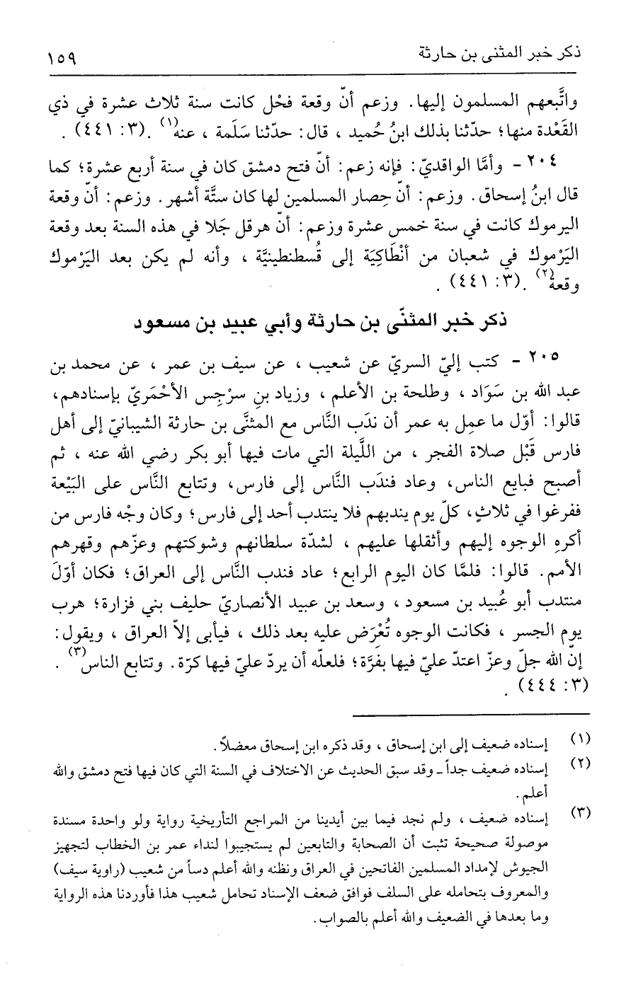 (٣) إسناده ضعيف، ولم نجد فيما بين أيدينا من المراجع التأريخية رواية ولو واحدة مسندة موصولة صحيحة تثبت أن الصحابة والتابعين لم يستجيبوا لنداء عمر بن الخطاب لتجهيز الجيوش لإمداد المسلمين الفاتحين في العراقط ونظنه والله أعلم دسًا من شعيب (راوية سيف) والمعروف بتحامله على السلف فوافق ضعف الإسناد تحامل شعيب هذا فأوردنا هذه الرواية وما بعدها في الضعيف والله أعلم بالصواب.