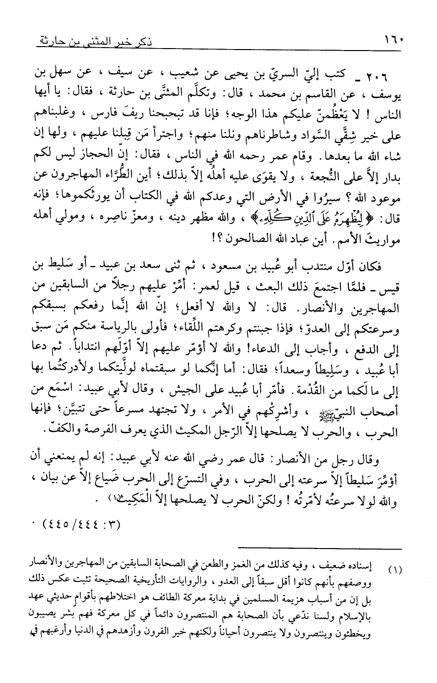 ٢٠٦ - كتب إليّ السريّ بن يحمى عن شعيب، عن سيف، عن سهل بن يوسف، عن القاسم بن محمد، قال: وتكلَّم المثنَّى بن حارثة، فقال: يا أيها الناس! لا يَعْظُمنّ عليكم هذا الوجه، فإنا قد تبحبحنا ريفَ فارس، وغلبناهم على خير شِقَّي السَّواد وشاطرناهم ونلنا منهم؛ واجترأ مَن قِبلنا عليهم، ولها إن شاء الله ما بعدها. وقام عمر رحمه الله في الناس، فقال: إنّ الحجاز ليس لكم بدار إلَّا على النُّجعة، ولا يقوَى عليه أهلُه إلّا بذلك؛ أين الطُرَّاء المهاجرون عن موعود الله؟ سيرُوا في الأرض التي وعدكم الله في الكتاب أن يورثَكموها؛ فإنه قال: {لِيُظْهِرَهُ عَلَى الدِّينِ كُلِّهِ}، والله مظهر دينه، ومعزّ ناصِره، ومولي أهله مواريثَ الأمم. أين عباد الله الصالحون؟ !