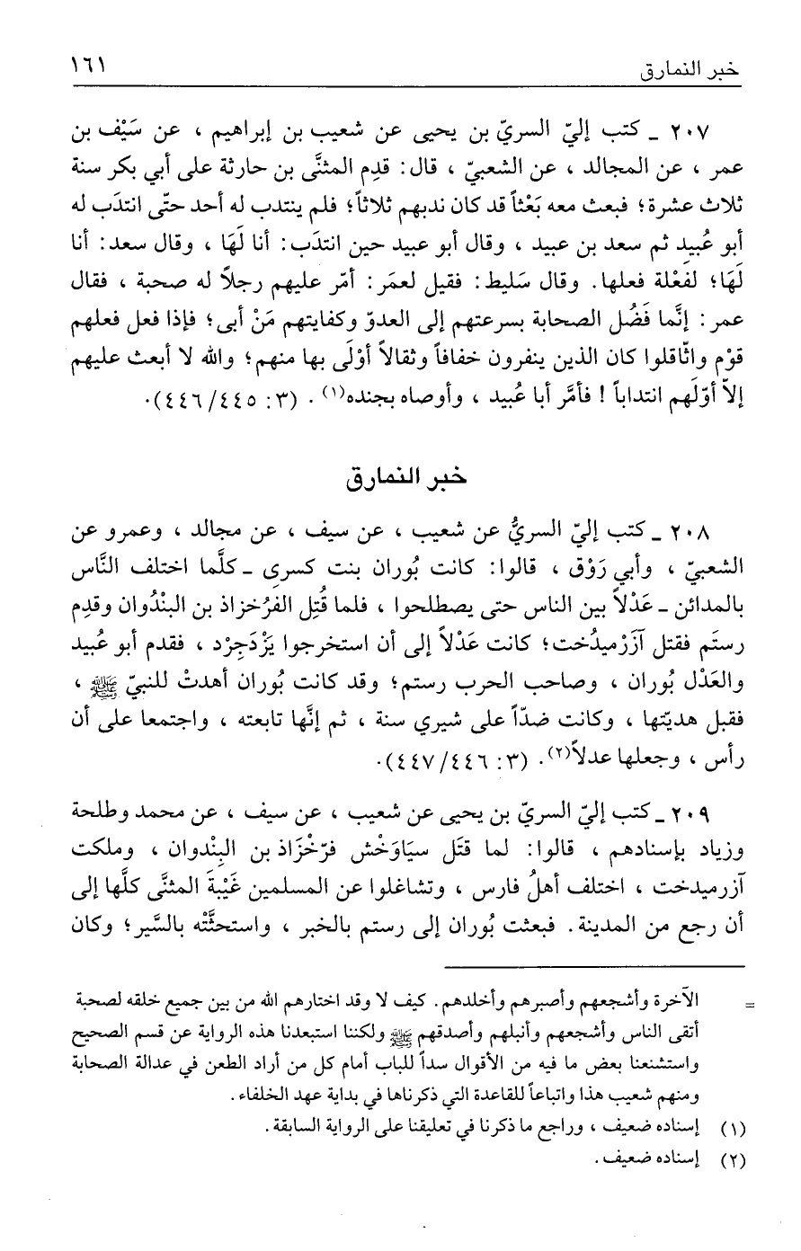 ٢٠٧ - كتب إليّ السريّ بن يحيى عن شعيب بن إبراهيم، عن سَيْف بن عمر، عن المجالد، عن الشعبيّ، قال: قدِم المثنَّى بن حارثة على أبي بكر سنة ثلاث عشرة؛ فبعث معه بَعْثًا قد كان ندبهم ثلاثًا؛ فلم ينتدب له أحد حتّى انتدَب له أبو عُبيد ثم سعد بن عبيد، وقال أبو عبيد حين انتدَب: أنا لَهَا، وقال سعد: أنا لَهَا؛ لفَعْلة فعلها. وقال سَليط: فقيل لعمَر: أمّر عليهم رجلًا له صحبة، فقال عمر: إنَّما فَضُل الصحابة بسرعتهم إلى العدوّ وكفايتهم مَنْ أبى؛ فإذا فعل فعلهم قوْم واثّاقلوا كان الذين ينفرون خفافًا وثقالًا أوْلَى بها منهم؛ والله لا أبعث عليهم إلّا أوّلَهم انتدابًا! فأمَّر أبا عُبيد، وأوصاه بجنده (١). (٣: ٤٤٥/ ٤٤٦).