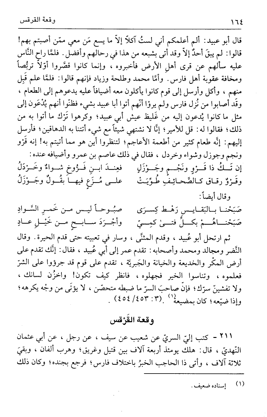 ٢١١ - كتب إليّ السريّ عن شعيب عن سيف، عن رجل، عن أبي عثمان النّهديّ، قال: هلك يومئذ أربعة آلاف بين قتيل وغريق؛ وهرب ألفان، وبقيَ ثلاثة آلاف، وأتى ذا الحاجب الخبرُ باختلاف فارس؛ فرجع بجنده؛ وكان ذلك