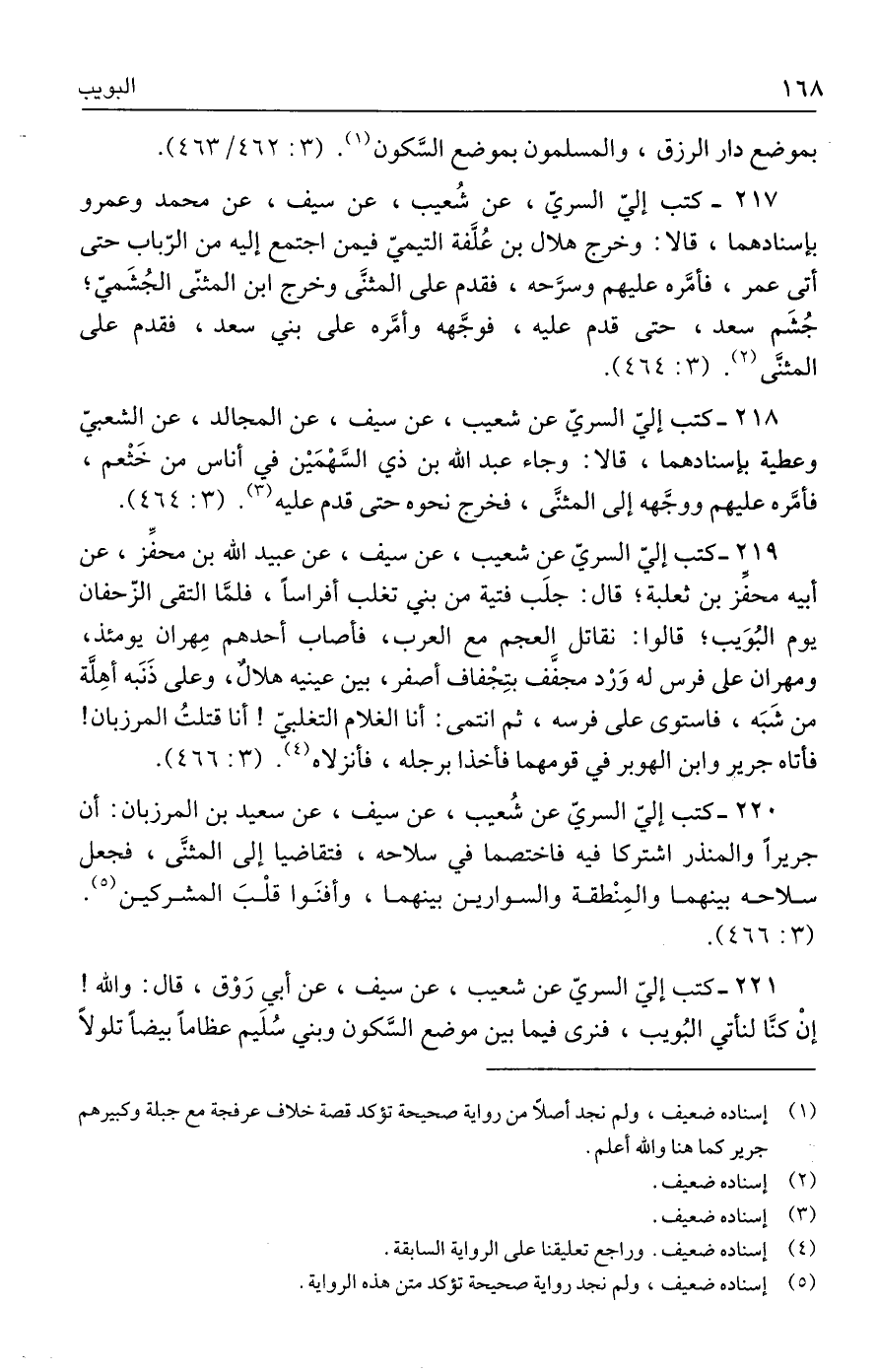 ٢١٧ - كتب إليّ السريّ، عن شُعيب، عن سيف، عن محمد وعمرو بإسنادهما، قالا: وخرج هلال بن عُلَّفة التيميّ فيمن اجتمع إليه من الرّباب حتى أتى عمر، فأمَّره عليهم وسرَّحه، فقدم على المثنَّى وخرج ابن المثنّى الجُشَميّ؛ جُشَم سعد، حتى قدم عليه، فوجَّهه وأمَّره على بني سعد، فقدم على المثنَّى (٢). (٣: ٤٦٤).