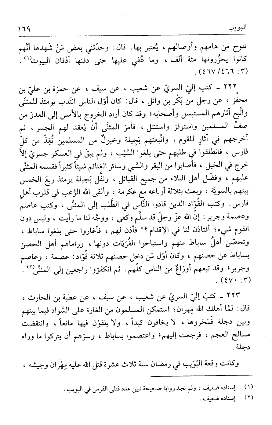 ٢٢٢ - كتب إليّ السريّ عن شعيب، عن سيف، عن حمزة بن عليّ بن محفِّز، عن رجل من بَكْر بن وائل، قال: كان أوّل الناس انتَدب يومئذ للمثنّى واتَّبع آثارهم المستبسل وأصحابه؛ وقد كان أراد الخروج بالأمس إلى العدوّ من صفِّ المسلمين واستوفز واستنتل، فأمرَ المثنَّى أنْ يُعقد لهم الجسر، ثم أخرجهم في آثارٍ للقوم، واتَّبعتهم بَجِيلة وخيولٌ من المسلمين تُغِذّ من كلّ فارس، فانطلقوا في طلبهم حتى بلغوا السِّيْب، ولم يبقَ في العسكر جسريّ إلَّا خرج في الخيل، فأصابوا من البقر والسَّبي وسائر الغنائم شيئًا كثيرًا فقسمه المثنَّى عليهم، وفضل أهل البلاء من جميع القبائل، ونفَّل بَجيلة يومئذ ربعَ الخمس بينهم بالسويَّة، وبعث بثلاثة أرباعه مع عكرمة، وألقى الله الرُّعب في قلوب أهلِ فارس. وكتب القُوّاد الذين قادوا النَّاس في الطَّلب إلى المثنَّى، وكتب عاصم وعصمة وجرير: إنّ الله عزّ وجلّ قد سلَّم وكفى، ووجَّه لنا ما رأيت، وليس دون القوم شيء؛ أفتاذن لنا في الإقدام؟ ! فأذن لهم، فأغاروا حتى بلغوا ساباط، وتحصّن أهلُ ساباط منهم واستباحوا القُرَيّات دونها، وراماهم أهل الحصن بساباط عن حصنهم، وكان أوّل مَن دخل حصنهم ثلاثة قُوّاد: عصمة، وعاصم وجرير؛ وقد تبعهم أوزاعٌ من الناس كلّهم. ثم انكفؤوا راجعين إلى المثنَّى (٢). (٣: ٤٧٠).