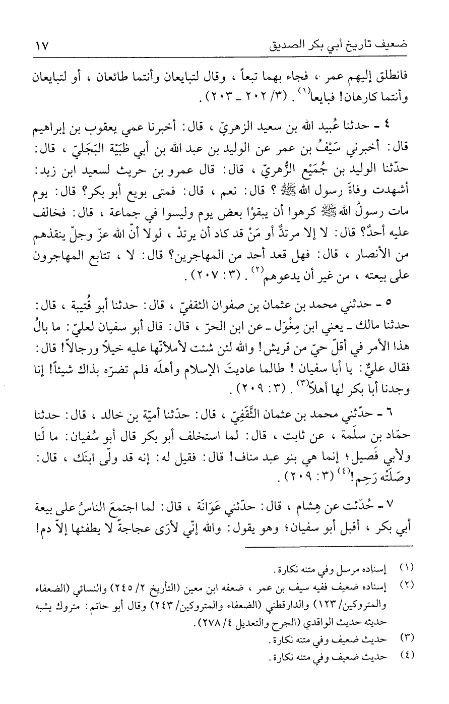 ٤ - حدثنا عُبيد الله بن سعيد الزهريّ، قال: أخبرنا عمي يعقوب بن إبراهيم قال: أخبرني سَيفُ بن عمر عن الوليد بن عبد الله بن أبي ظبَية البَجَليّ، قال: حدَّثنا الوليد بن جُمَيع الزُّهريّ، قال: قال عمرو بن حريث لسعيد بن زيد: أشهدت وفاةَ رسول الله - صلى الله عليه وسلم -؟ قال: نعم، قال: فمتى بويع أبو بكر؟ قال: يوم مات رسولُ الله - صلى الله عليه وسلم - كرهوا أن يبقوْا بعض يوم وليسوا في جماعة، قال: فخالف عليه أحدٌ؟ قال: لا إلا مرتدٌّ أو مَنْ قد كاد أن يرتدْ، لولا أنّ الله عزّ وجلّ ينقذهم من الأنصار، قال: فهل قعد أحد من المهاجرين؟ قال: لا، تتابع المهاجرون على بيعته، من غير أن يدعوهم (٢). (٣: ٢٠٧).
