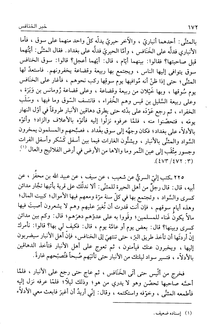 ٢٢٥ - كتب إليّ السريُّ عن شعيب، عن سيف، عن عبيد الله بن محفِّز، عن أبيه، قال: قال رجلٌ من أهل الحيرة للمثنّى: ألا ندلّك على قرية يأتيها تجَّار مدائن كسرى والسَّواد، وتجتمع بها في كلّ سنة مرّة ومعهم فيها الأموال؛ كبيت المال؛ وهذه أيام سوقهم، فإن أنت قدرت أن تُغيرَ عليهم وهم لا يشعرون أصبتَ فيها مالًا يكون غَناء للمسلمين؛ وقَووا به على عدوّهم دهرَهم؛ قال: وكم بين مدائن كسرى وبينها؟ قال: بعض يوم أو عامَّة يوم، قال: فكيف لي بها؟ قالوا: نأمرك إنْ أردتَها أن تأخذ طريق البرّ، حتى تنتهيَ إلى الخنافس، فإنّ أهل الأنبار سيضربون إليها، ويخبرون عنك فيأمنون، ثم تعوج على أهل الأنبار فتأخذ الدهاقين بالأدلّاء، فتسير سواد ليلتك من الأنبار حتى تأتيَهم صُبحًا فتُصبّحهم غارةً.