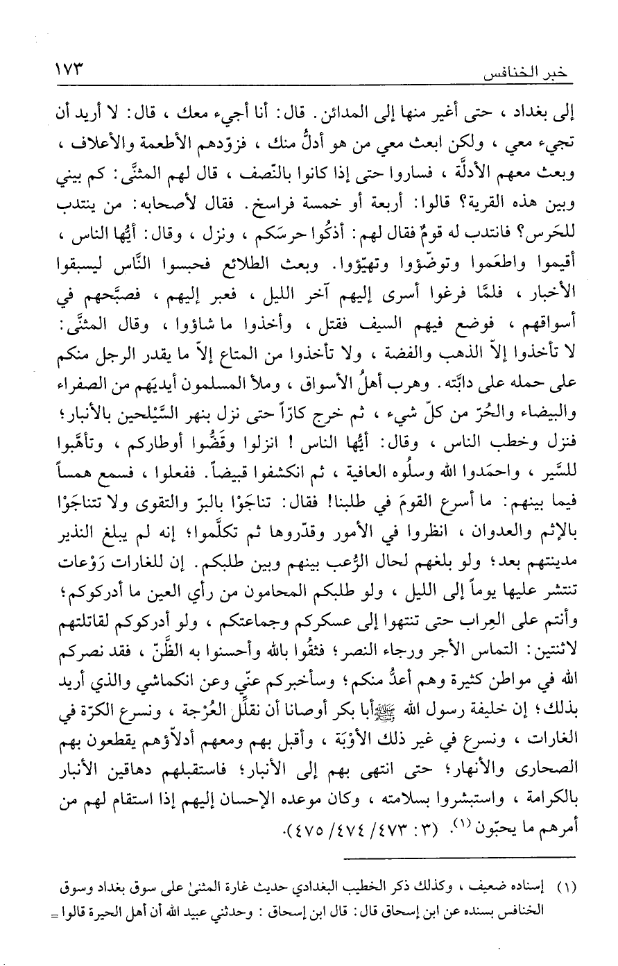 (١) إسناده ضعيف، وكذلك ذكر الخطيب البغدادي حديث غارة المثنى على سوق بغداد وسوق الخنافس بسنده عن ابن إسحاق قال: قال ابن إسحاق: وحدثني عبيد الله أن أهل الحيرة قالوا =