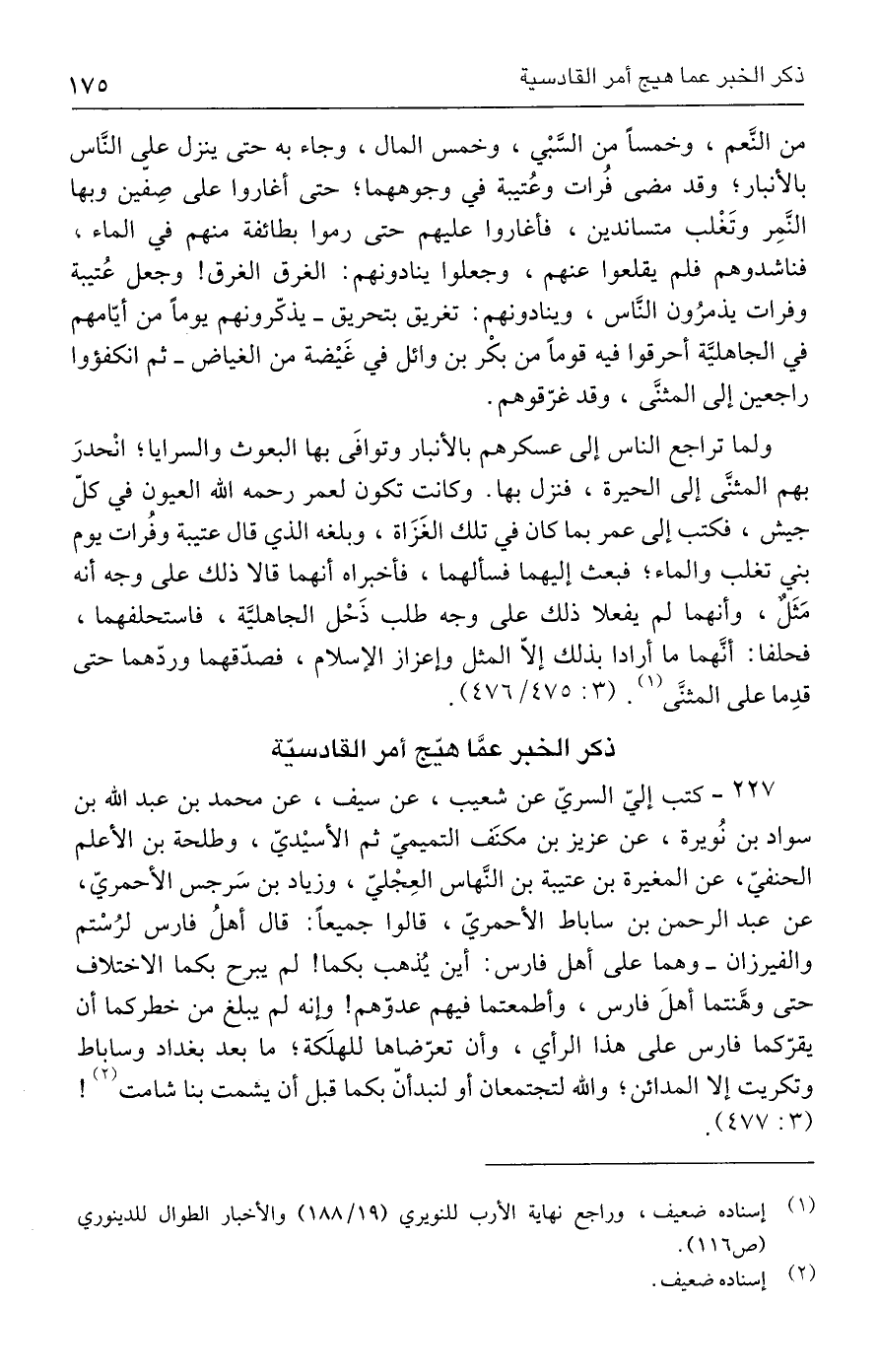 ٢٢٧ - كتب إليّ السريّ عن شعيب، عن سيف، عن محمد بن عبد الله بن سواد بن نُويرة، عن عزيز بن مكنَف التميميّ ثم الأسيْديّ، وطلحة بن الأعلم الحنفيّ، عن المغيرة بن عتيبة بن النَّهاس العِجْليّ، وزياد بن سَرجس الأحمريّ، عن عبد الرحمن بن ساباط الأحمريّ، قالوا جميعًا: قال أهلُ فارس لرُسْتم والفيرزان - وهما على أهل فارس: أين يُذهب بكما! لم يبرح بكما الاختلاف حتى وهَّنتما أهلَ فارس، وأطمعتما فيهم عدوّهم! وإنه لم يبلغ من خطركما أن يقرّكما فارس على هذا الرأي، وأن تعرّضاها للهلَكة؛ ما بعد بغداد وساباط وتكريت إلا المدائن؛ والله لتجتمعان أو لنبدأنّ بكما قبل أن يشمت بنا شامت (٢)! (٣: ٤٧٧).