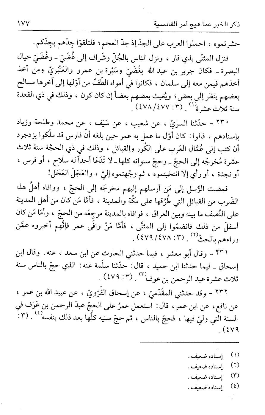 ٢٣٠ - حدّثنا السريّ، عن شعيب، عن سَيْف، عن محمد وطلحة وزياد بإسنادهم، قالوا: كان أوّل ما عمل به عمر حين بلغه أنّ فارس قد ملّكوا يزدجرد أن كتب إلى عُمَّال العَرب على الكُور والقبائل، وذلك في ذي الحجَّة سنة ثلاث عشرة مُخرجَه إلى الحجّ - وحجّ سنواته كلها - لا تَدَعَا أحدًا له سلاح، أو فرس، أو نجدة، أو رأي إلا انتخبتموه، ثم وجّهتموه إليّ، والعَجَلَ العَجَل!