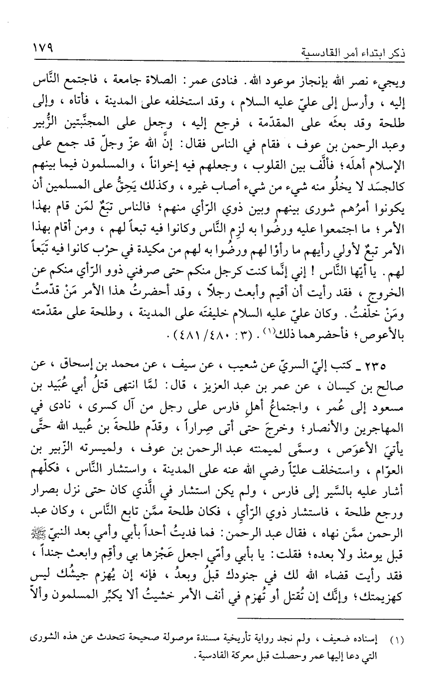 ٢٣٥ - كتب إليّ السريّ عن شعيب، عن سيف، عن محمد بن إسحاق، عن صالح بن كيسان، عن عمر بن عبد العزيز، قال: لمَّا انتهى قتلُ أبي عُبَيد بن مسعود إلى عمر، واجتماعُ أهلِ فارس على رجل من آل كسرى، نادى في المهاجرين والأنصار، وخرجَ حتى أتى صِرارًا، وقذم طلحةَ بن عُبيد الله حتَّى يأتيَ الأعوَص، وسمَّى لميمنته عبد الرحمن بن عوف، ولميسرته الزّبير بن العوّام، واستخلف عليًّا رضي الله عنه على المدينة، واستشار النَّاس، فكلّهم أشار عليه بالسَّير إلى فارس، ولم يكن استشار في الَّذي كان حتى نزل بصرار ورجع طلحة، فاستشار ذوي الرّأيِ، فكان طلحة ممَّن تابع النَّاس، وكان عبد الرحمن ممَّن نهاه، فقال عبد الرحمن: فما فديتُ أحدًا بأبي وأمي بعد النبيّ - صلى الله عليه وسلم - قبل يومئذ ولا بعده؛ فقلت: يا بأبي وأمّي اجعل عَجْزها بي وأقِم وابعث جندًا، فقد رأيت قضاء الله لك في جنودك قبلُ وبعدُ، فإنه إن يُهزم جيشُك ليس كهزيمتك، وإنَّك إن تُقتل أو تُهزم في أنف الأمر خشيتُ ألا يكبِّر المسلمون وألّا