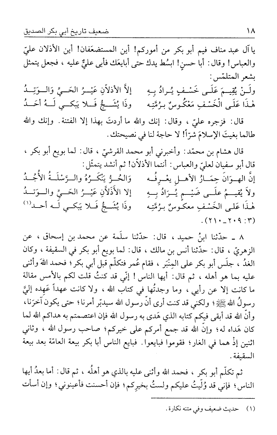 ٨ - حدَّثنا ابنُ حميد، قال: حدَّثنا سلَمة عن محمد بن إسحاق، عن الزهريّ، قال: حدَّثنا أنس بن مالك، قال: لما بويع أبو بكر في السقيفة، وكان الغدُ، جلَس أبو بكر على المِنْبَر، فقام عُمر فتكلّم قبل أبي بكر؛ فحمد اللهَ وأثنى عليه بما هو أهله، ثم قال: أيها الناس! إنّي قد كنتُ قلت لكم بالأمس مقالة ما كانت إلا عن رأي، وما وجدتُها في كتاب الله، ولا كانت عهدًا عَهِده إليَّ رسول الله - صلى الله عليه وسلم -؛ ولكني قد كنت أرى أنّ رسول الله سيدبّر أمرنا؛ حتى يكون آخرَنا، وأن الله قد أبقى فيكم كتابه الذي هَدى به رسول الله فإن اعتصمتم به هداكم الله لما كان هَداه له؛ وإنّ الله قد جمع أمركم على خيركم؛ صاحب رسول الله، وثاني اثنين إذْ هما في الغار؛ فقوموا فبايعوا. فبايع الناس أبا بكر بيعة العامّة بعد بيعة السقيفة.