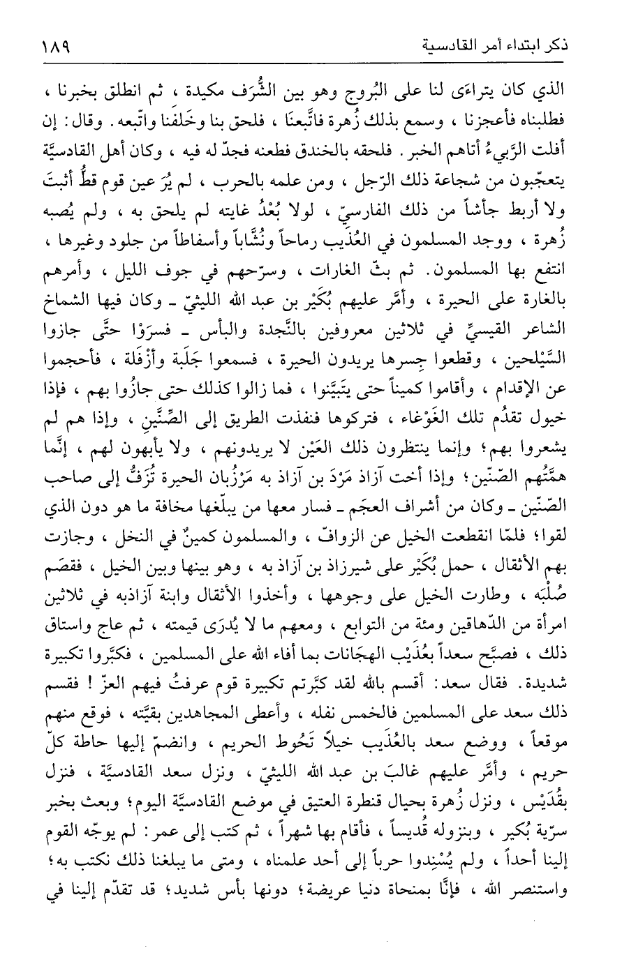 الذي كان يتراءَى لنا على البُروج وهو بين الشُّرَف مكيدة، ثم انطلق بخبرنا، فطلبناه فأعجزنا، وسمع بذلك زُهرة فاتَّبعنَا، فلحق بنا وخَلفَنا واتّبعه. وقال: إن أفلت الرَّبيءُ أتاهم الخبر. فلحقه بالخندق فطعنه فجدّ له فيه، وكان أهل القادسيَّة يتعجّبون من شجاعة ذلك الرّجل، ومن علمه بالحرب، لم يُرَ عين قوم قطُّ أثبتَ ولا أربط جأشًا من ذلك الفارسيّ، لولا بُعْدُ غايته لم يلحق به، ولم يُصبه زُهرة، ووجد المسلمون في العُذَيب رماحًا ونُشَّابًا وأسفاطًا من جلود وغيرها، انتفع بها المسلمون. ثم بثّ الغارات، وسرّحهم في جوف الليل، وأمرهم بالغارة على الحيرة، وأمَّر عليهم بُكَيْر بن عبد الله الليثيّ - وكان فيها الشماخ الشاعر القيسيِّ في ثلاثين معروفين بالنَّجدة والبأس - فسرَوْا حتَّى جازوا السَّيْلحين، وقطعوا جِسرها يريدون الحيرة، فسمعوا جَلَبة وأزْفَلة، فأحجموا عن الإقدام، وأقاموا كمينًا حتى يتَبيَّنوا، فما زالوا كذلك حتى جازُوا بهم، فإذا خيول تقدُم تلك الغَوْغاء، فتركوها فنفذت الطريق إلى الصِّنَينِ، وإذا هم لم يشعروا بهم؛ وإنما ينتظرون ذلك العَيْن لا يريدونهم، ولا يأبهون لهم، إنَّما همَّتُهم الصّنّين؛ وإذا أخت آزاذ مَرْدَ بن آزاذ به مَرْزُبان الحيرة تُزَفُّ إلى صاحب الصّنّين - وكان من أشراف العجَم - فسار معها من يبلّغها مخافة ما هو دون الذي لقوا؛ فلمّا انقطعت الخيل عن الزوافّ، والمسلمون كمينٌ في النخل، وجازت بهم الأثقال، حمل بُكَيْر على شيرزاذ بن آزاذ به، وهو بينها وبين الخيل، فقصَم صُلْبَه، وطارت الخيل على وجوهها، وأخذوا الأثقال وابنة آزاذبه في ثلاثين امرأة من الدّهاقين ومئة من التوابع، ومعهم ما لا يُدرَى قيمته، ثم عاج واستاق ذلك، فصبَّح سعدًا بعُذَيْب الهجَانات بما أفاء الله على المسلمين، فكبَّروا تكبيرة شديدة. فقال سعد: أقسم بالله لقد كبَّرتم تكبيرة قوم عرفتُ فيهم العزّ! فقسم ذلك سعد على المسلمين فالخمس نفله، وأعطى المجاهدين بقيَّته، فوقع منهم موقعًا، ووضع سعد بالعُذَيب خيلًا تَحُوط الحريم، وانضمّ إليها حاطة كلّ حريم، وأمَّر عليهم غالبَ بن عبد الله الليثيّ، ونزل سعد القادسيَّة، فنزل بقُدَيْس، ونزل زُهرة بحيال قنطرة العتيق في موضع القادسيَّة اليوم؛ وبعث بخبر سرّية بُكير، وبنزوله قُديسًا، فأقام بها شهرًا، ثم كتب إلى عمر: لم يوجّه القوم إلينا أحدًا، ولم يُسْنِدوا حربًا إلى أحد علمناه، ومتى ما يبلغنا ذلك نكتب به؛ واسنصر الله، فإنَّا بمنحاة دنيا عريضة؛ دونها بأس شديد؛ قد تقدّم إلينا في