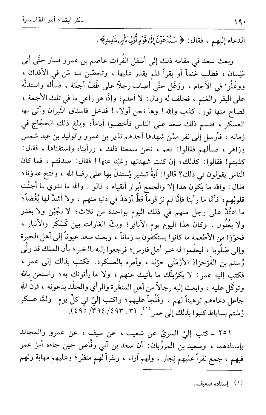 ٢٥١ - كتب إليَّ السريّ عن شعيب، عن سيف، عن عمرو والمجالد بإسنادهما، وسعيد بن المرزُبان: أن سعد بن أبي وقَّاص حين جاءه أمرُ عمر فيهم، جمع نفرًا عليهم نِجار، ولهم آراء، ونفرًا لهم منظر؛ وعليهم مهابة ولهم