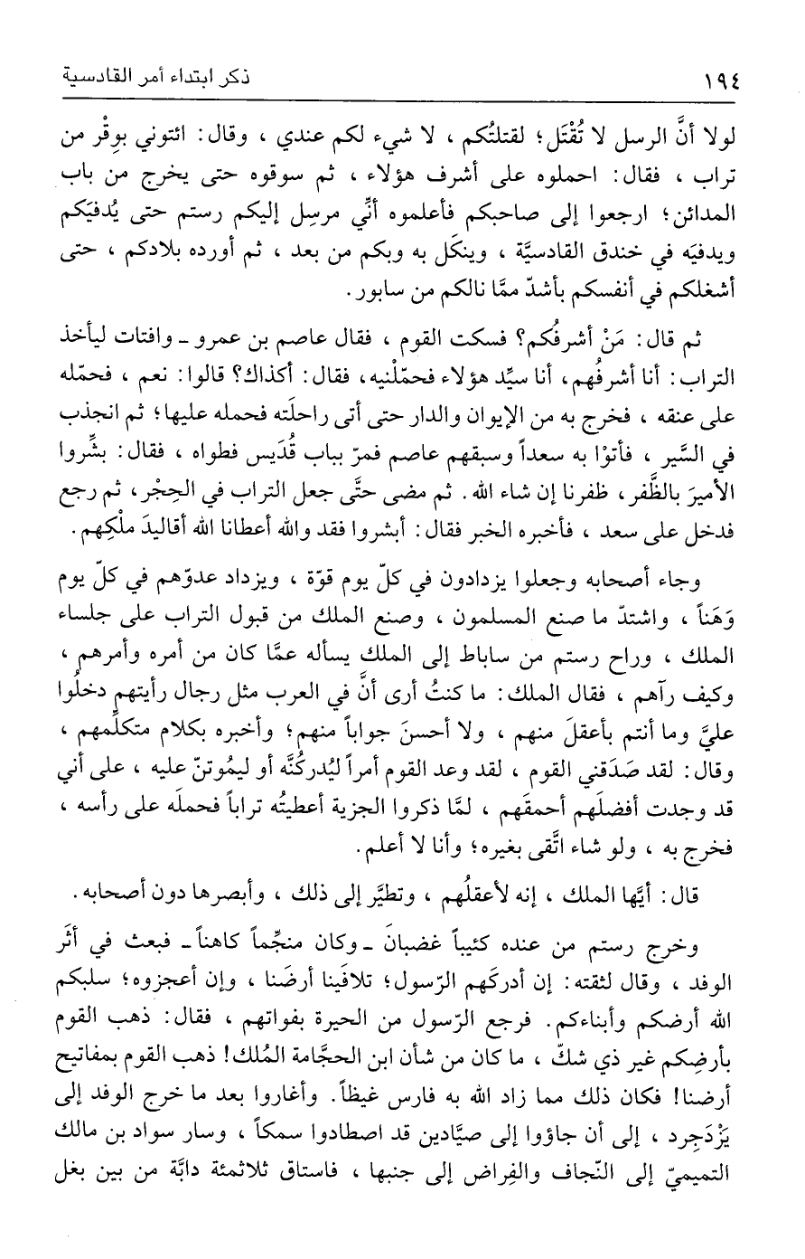 وجاء أصحابه وجعلوا يزدادون في كلّ يوم قوّة، ويزداد عدوّهم في كلّ يوم وَهَنًا، واشتدّ ما صنع المسلمون، وصنع الملك من قبول التراب على جلساء الملك، وراح رستم من ساباط إلى الملك يسأله عمَّا كان من أمره وأمرهم، وكيف رآهم، فقال الملك: ما كنتُ أرى أنَّ في العرب مثل رجال رأيتهم دخلُوا عليَّ وما أنتم بأعقلَ منهم، ولا أحسنَ جوابًا منهم؛ وأخبره بكلام متكلِّمهم، وقال: لقد صَدَقني القوم، لقد وعد القوم أمرًا ليُدركُنَّه أو ليمُوتنّ عليه، على أني قد وجدت أفضلَهم أحمقَهم، لمَّا ذكروا الجزية أعطيتُه ترابًا فحملَه على رأسه، فخرج به، ولو شاء اتَّقى بغيره؛ وأنا لا أعلم.