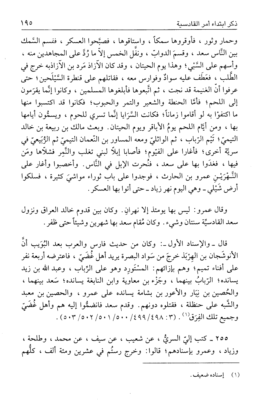 ٢٥٥ - كتب إليّ السريُّ، عن شعيب، عن سيف، عن محمد، وطلحة، وزياد، وعمرو بإسنادهم؛ قالوا: وخرج رستُم في عشرين ومئة ألف، كلُّهم