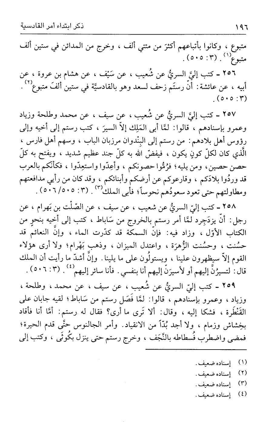 ٢٥٦ - كتب إليَّ السريُّ عن شُعيب، عن سَيْف، عن هشام بن عروة، عن أبيه، عن عائشة: أنّ رستَم زحف لسعد وهو بالقادسيَّة في ستين ألفَ متبوع (٢). (٥٠٥: ٣).