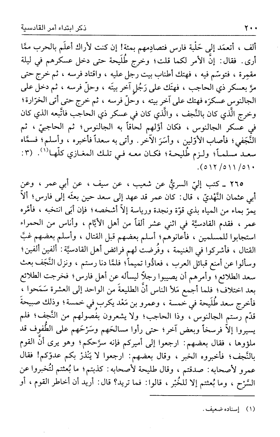 ٢٦٥ - كتب إليّ السريُّ عن شعيب، عن سيف، عن أبي عمر، وعن أبي عثمان النَّهْديّ، قال: كان عمر قد عهد إلى سعد حين بعثَه إلى فارس؛ ألّا يمرّ بماء من المياه بذي قوّة ونجدة ورياسة إلّا أشخصه؛ فإن أبَى انتخبه، فأمَّره عمر، فقدم القادسيَّة في اثني عشر ألفًا من أهل الأيَّام، وأناس من الحمراء استجابوا للمسلمين، فأعانوهم؛ أسلم بعضهم قبل القتال، وأسلم بعضهم غبَّ القتال، فأشركوا في الغنيمة، وفُرضت لهم فرائض أهل القادسيَّة: ألفين ألفين؛ وسألوا عن أمنع قبائل العرب، فعادُّوا تميمًا؛ فلمَّا دنا رستم، ونزل النَّجَف بعث سعد الطلائع؛ وأمرهم أن يصيبوا رجلًا ليسأله عن أهل فارس؛ فخرجت الطلائع بعد اختلاف؛ فلما أجمع مَلأ الناس أنَّ الطليعةَ من الواحد إلى العشرة سَمَحوا، فأخرج سعد طُلَيحة في خمسة، وعمرو بن مَعْد يكرب في خمسة؛ وذلك صبيحةَ قدّم رستيم الجالنوس، وذا الحاجب؛ ولا يشعرون بفُصولهم من النَّجف؛ فلم يسيروا إلا فرسخًا وبعض آخر؛ حتى رأوا مسالحَهم وسَرْحَهم على الطُّفوف قد ملؤوها، فقال بعضهم: ارجعوا إلى أميركم فإنه سرَّحكم؛ وهو يرى أنَّ القوم بالنَّجف؛ فأخبروه الخبر، وقال بعضهم: ارجعوا لا يَنْذرْ بكم عدوّكم! فقال عمرو لأصحابه: صدقتم، وقال طليحة لأصحابه: كذبتم؛ ما بُعثتم لتُخبروا عن السَّرْح، وما بُعثتم إلا للخُبْر، قالوا: فما تريد؟ قال: أريد أن أخاطر القوم، أو