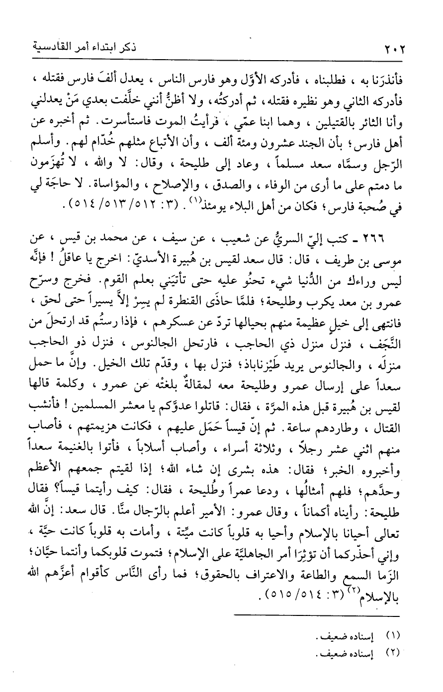 ٢٦٦ - كتب إليّ السريّ عن شعيب، عن سيف، عن محمد بن قيس، عن موسى بن طريف، قال: قال سعد لقيس بن هُبيرة الأسديّ: اخرج يا عاقلُ! فإنَّه ليس وراءك من الدّنيا شيء تحنُو عليه حتى تأتيَني بعلم القوم. فخرج وسرّح عمرو بن معد يكرب وطليحة؛ فلمَّا حاذَى القنطرة لم يسِرْ إلّا يسيرًا حتى لحق، فانتهى إلى خيلٍ عظيمة منهم بحيالها تردّ عن عسكرهم، فإذا رستُم قد ارتحلَ من النَّجَف، فنزل منزل ذي الحاجب، فارتحل الجالنوس، فنزل ذو الحاجب منزلَه، والجالنوس يريد طَيْزناباذ؛ فنزل بها، وقدّم تلك الخيل. وإنَّ ما حمل سعدًا على إرسال عمرو وطليحة معه لمقالةٌ بلغتْه عن عمرو، وكلمة قالها لقيس بن هُبيرة قبل هذه المرَّة، فقال: قاتلوا عدوَّكم يا معشر المسلمين! فأنشب القتال، وطاردهم ساعة. ثم إنّ قيسًا حَمَل عليهم، فكانت هزيمتهم، فأصاب منهم اثني عشر رجلًا، وثلاثة أسراء، وأصاب أسلابًا، فأتوا بالغنيمة سعدًا وأخبروه الخبر؛ فقال: هذه بشرى إن شاء الله؛ إذا لقيتم جمعهم الأعظم وحدَّهم؛ فلهم أمثالُها، ودعا عمرًا وطُليحة، فقال: كيف رأيتما قيسًا؟ فقال طليحة: رأيناه أكمانًا، وقال عمرو: الأمير أعلم بالرّجال منَّا. قال سعد: إنَّ الله تعالى أحيانا بالإسلام وأجيا به قلوبًا كانت ميِّتة، وأمات به قلوبًا كانت حيَّة، وإني أحذّركما أن تؤثِرَا أمر الجاهليَّة على الإسلام؛ فتموت قلوبكما وأنتما حيَّان؛ الزَما السمع والطاعة والاعتراف بالحقوق؛ فما رأى النَّاس كأقوام أعزَّهم الله بالإسلام (٢) (٣: ٥١٤/ ٥١٥).